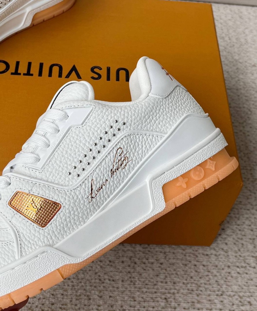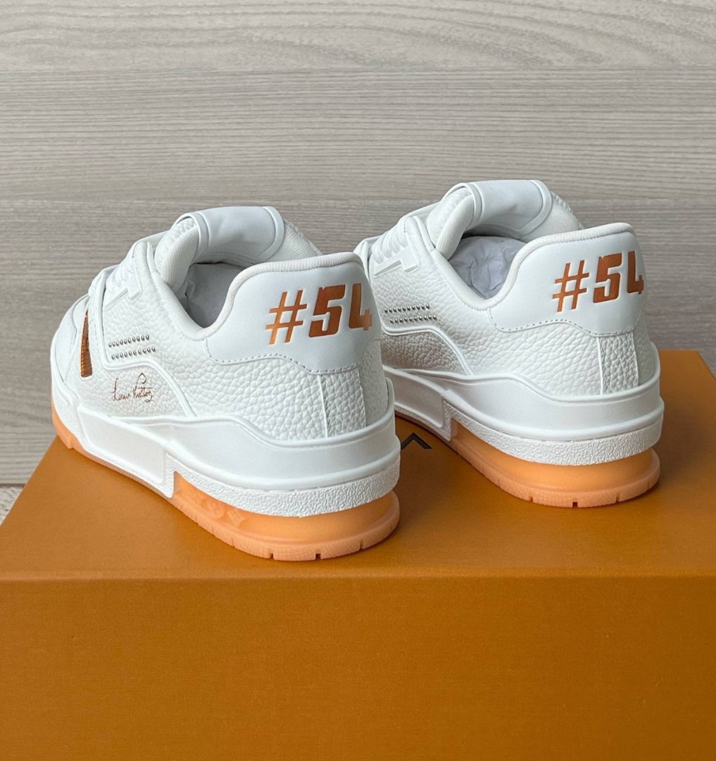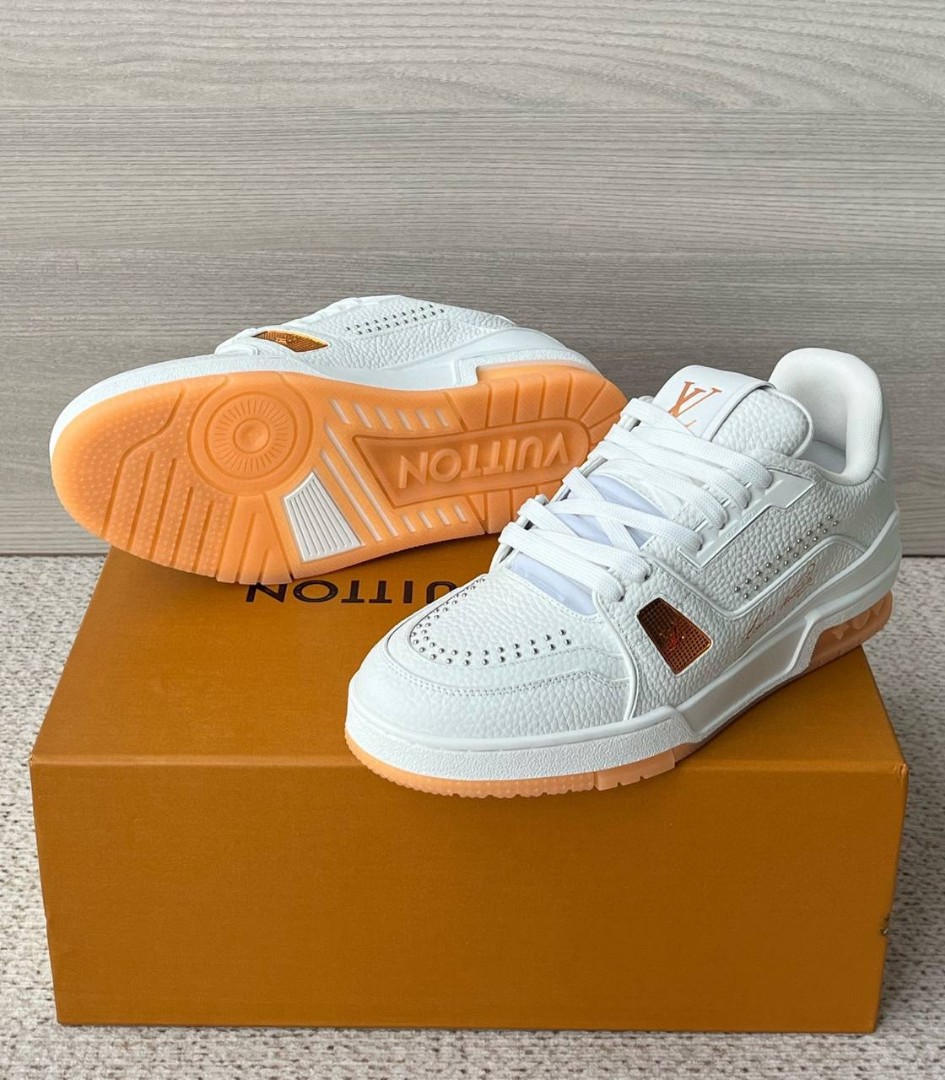 Мужские кожаные кроссовки Louis Vuitton Trainer белые с оранжевой подошвой 2025