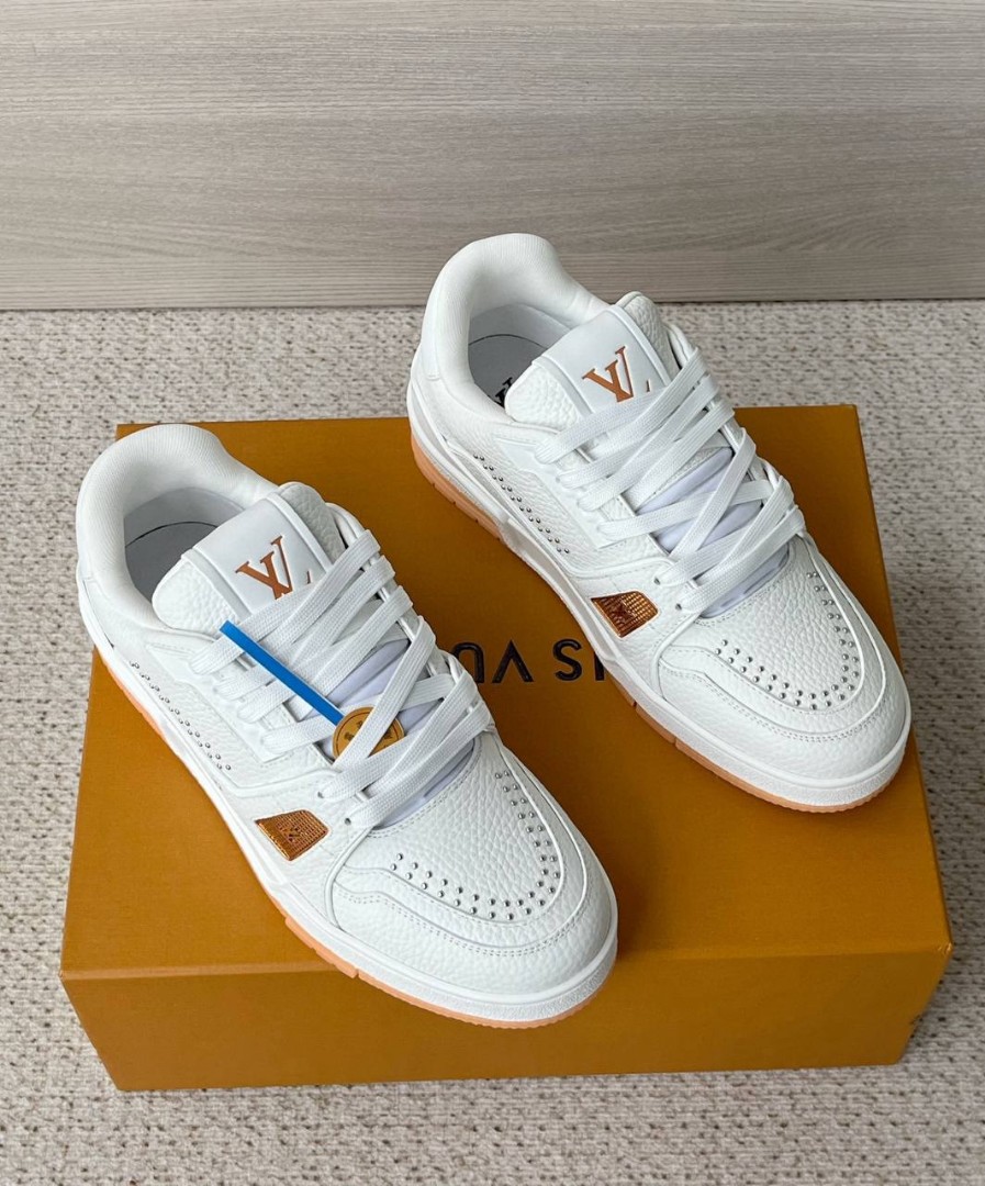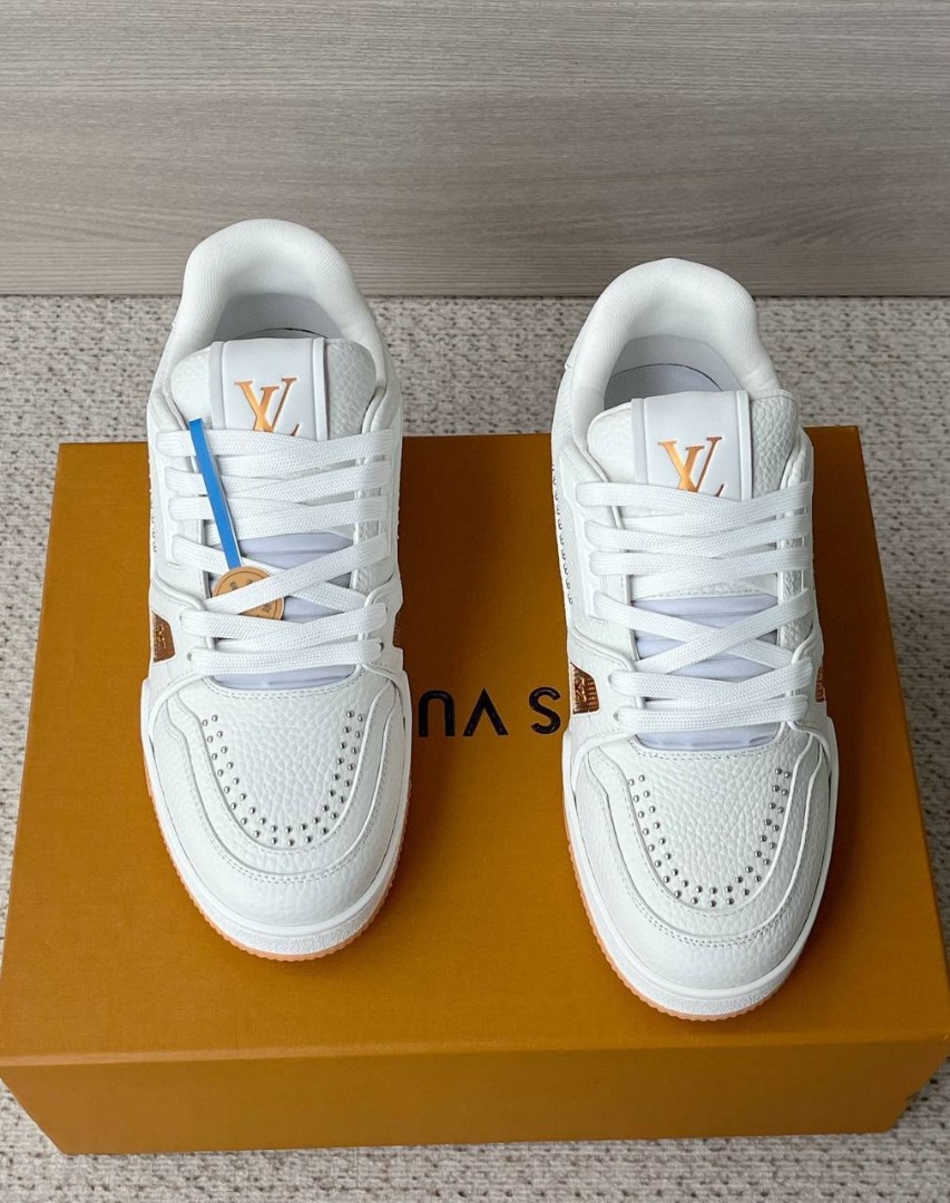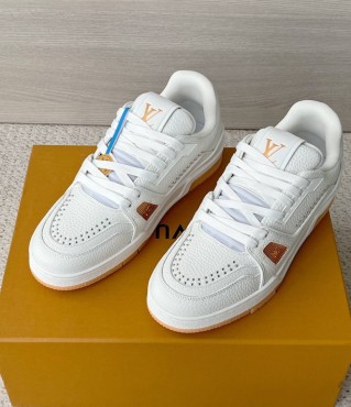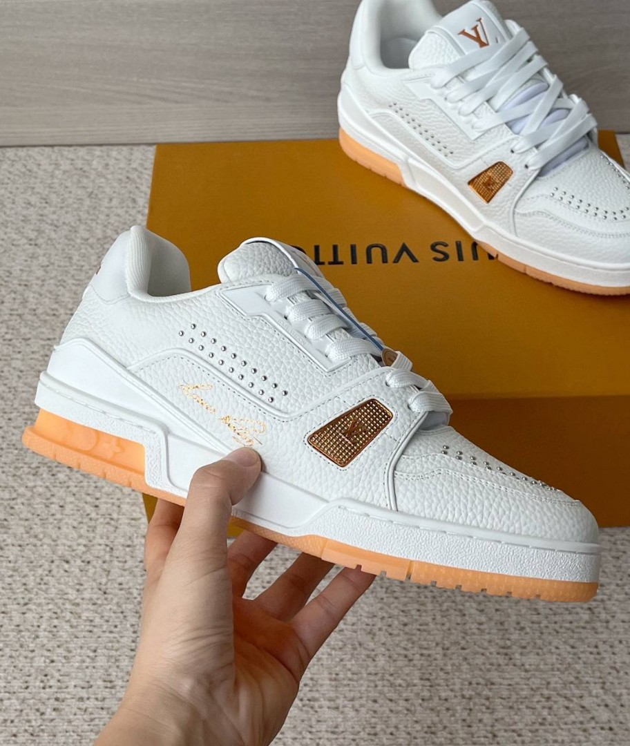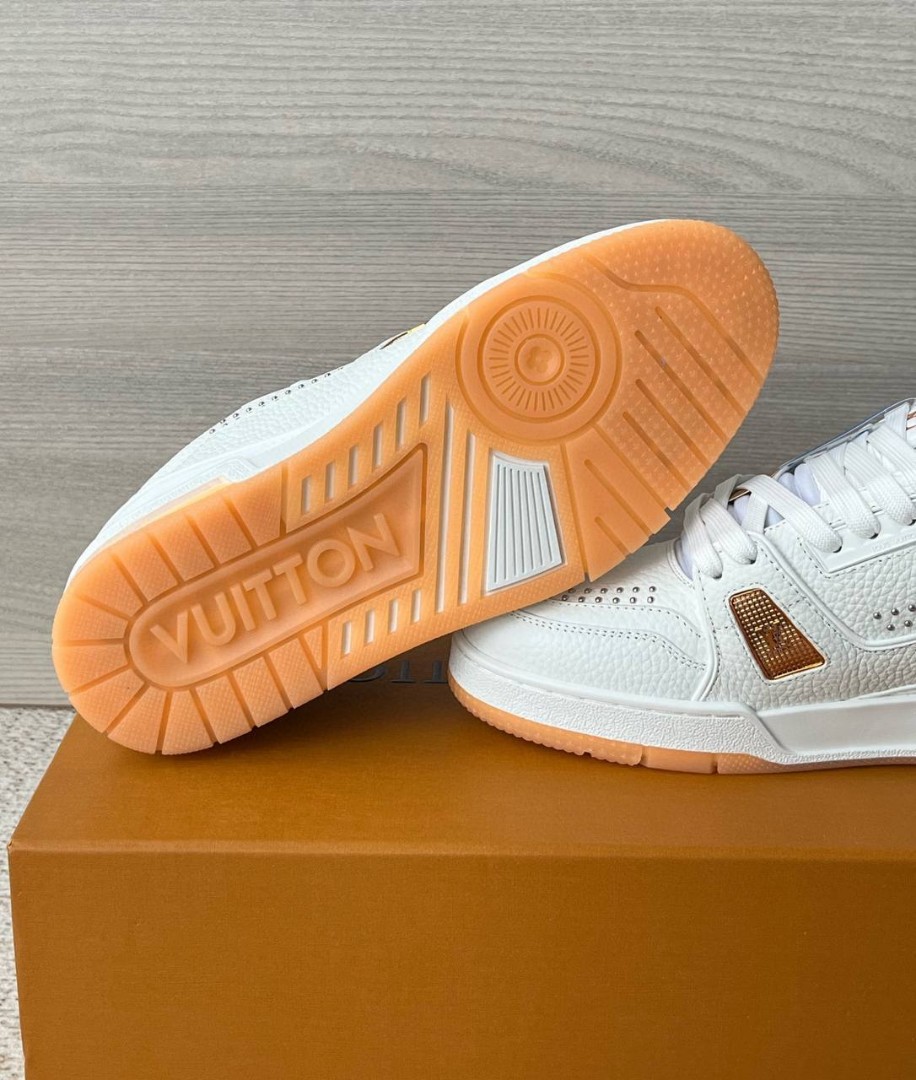 Мужские кожаные кроссовки Louis Vuitton Trainer белые с оранжевой подошвой 2025