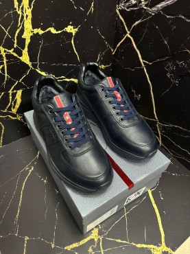 Мужские кожаные кроссовки Prada 2023 темно-синие на меху