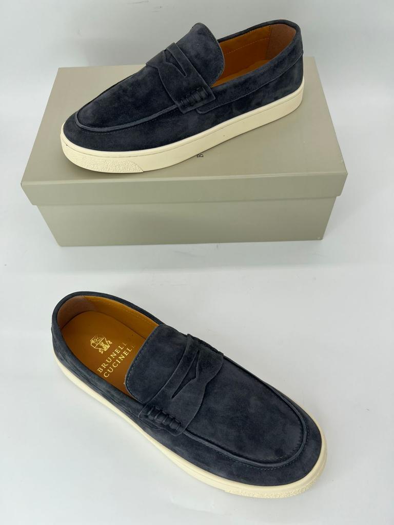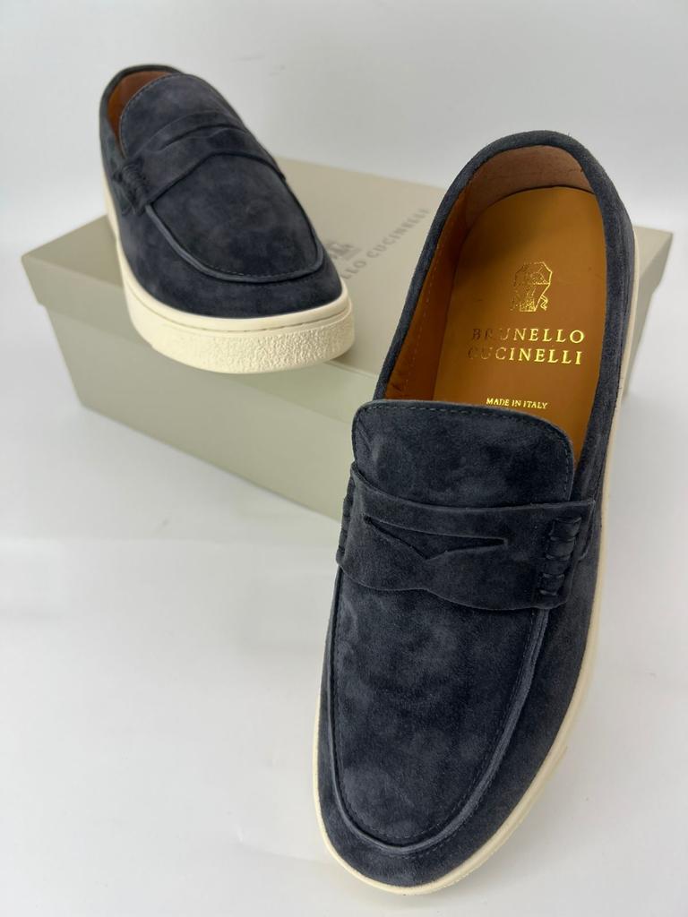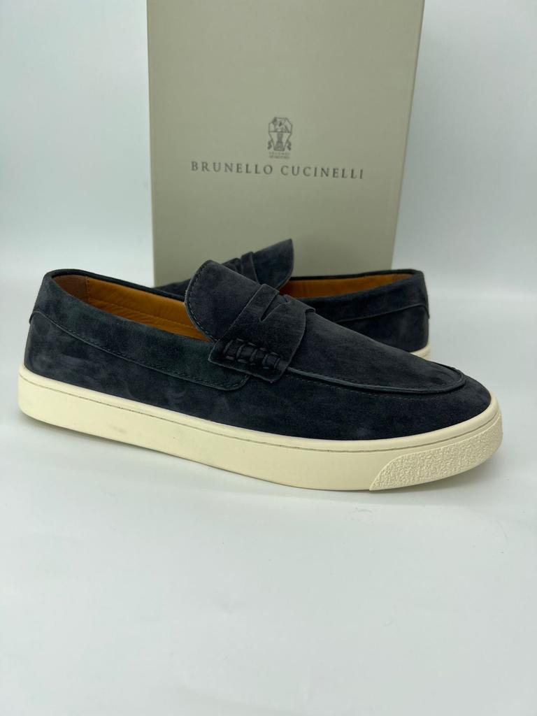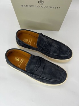 Мужские лоферы Brunello Cucinelli 2022-2023 темно-серые замшевые с белой подошвой