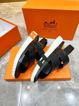 Мужские кожаные сандалии Hermes 2024 черные с оранжевым на подошве
