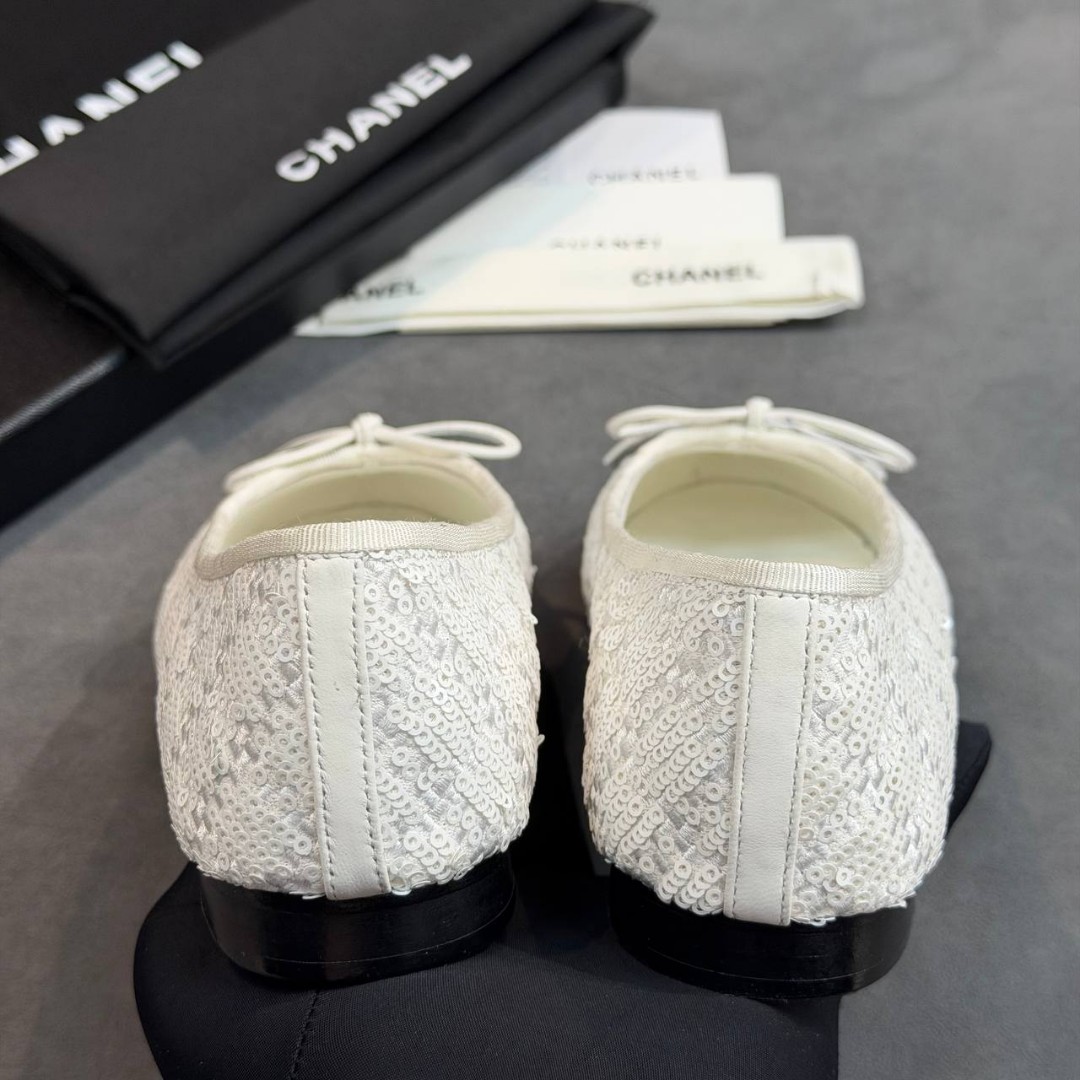 Женские текстильные балетки в пайетках Chanel белые с черным носом 2026