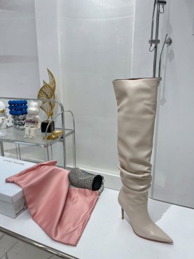 Женские кожаные ботфорты Amina Muaddi 2023 на каблуке бежевые