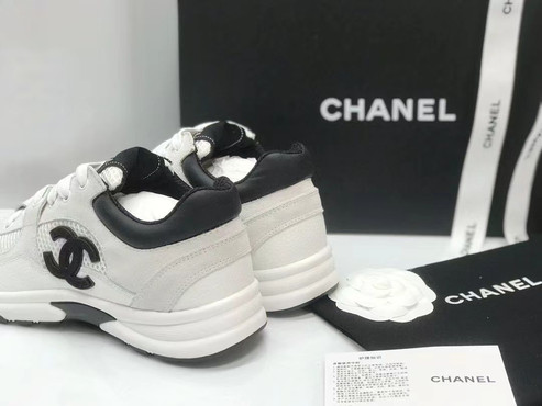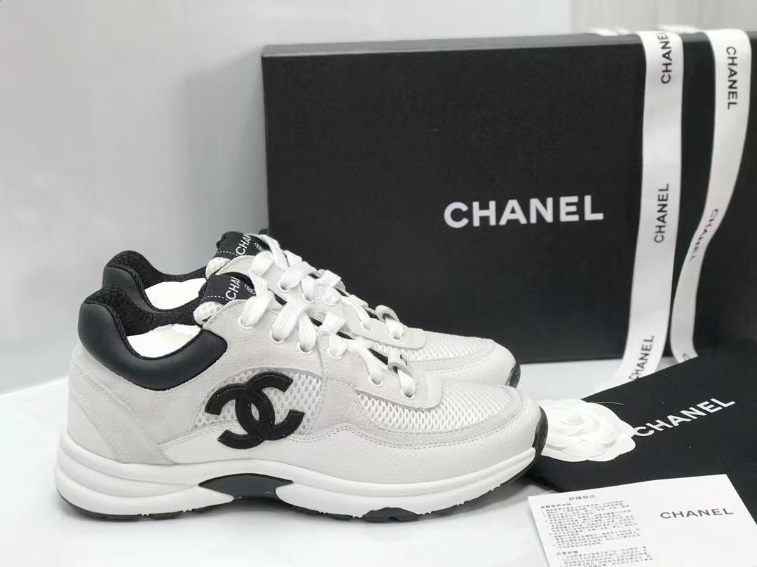 Женские комбинированные кроссовки Chanel 2023-2024 белые с черным логотипом