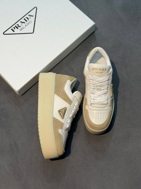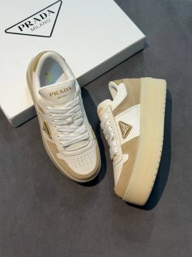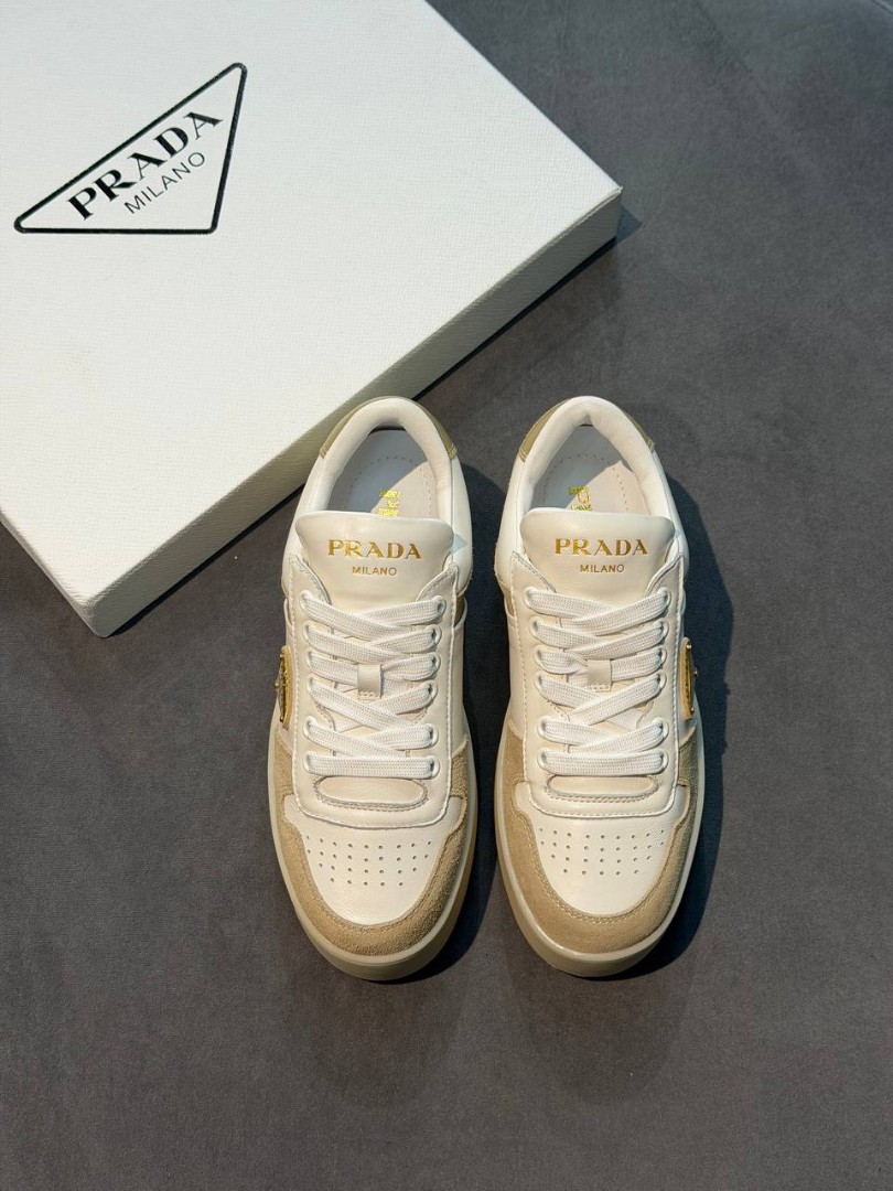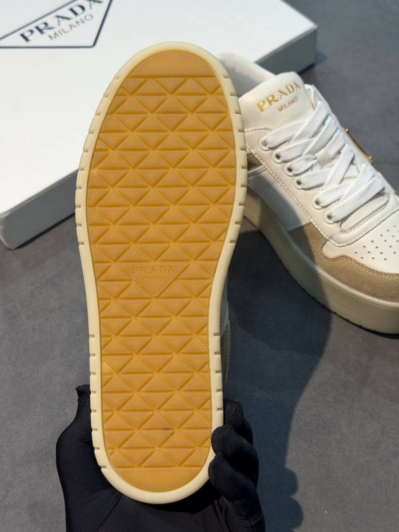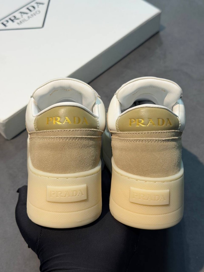 Женские комбинированные кроссовки Prada белые с бежевым на платформе 2026