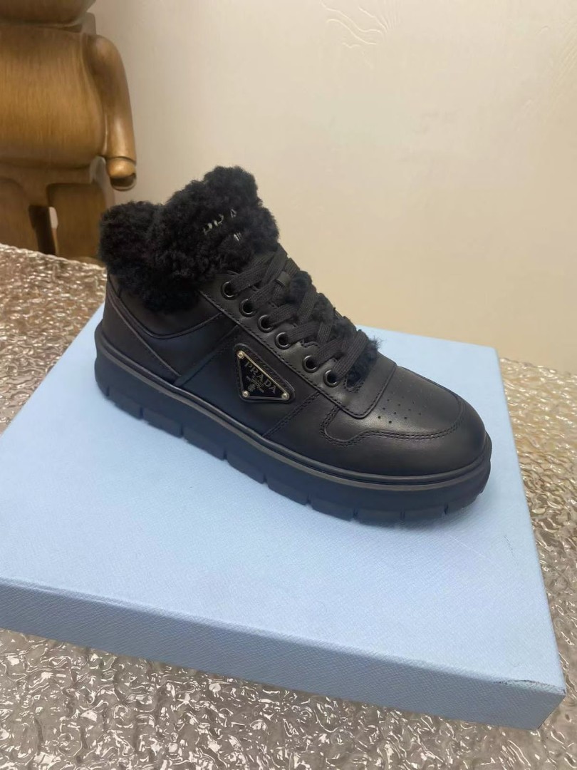 Женские кожаные высокие кроссовки Prada 2023 на меху черные