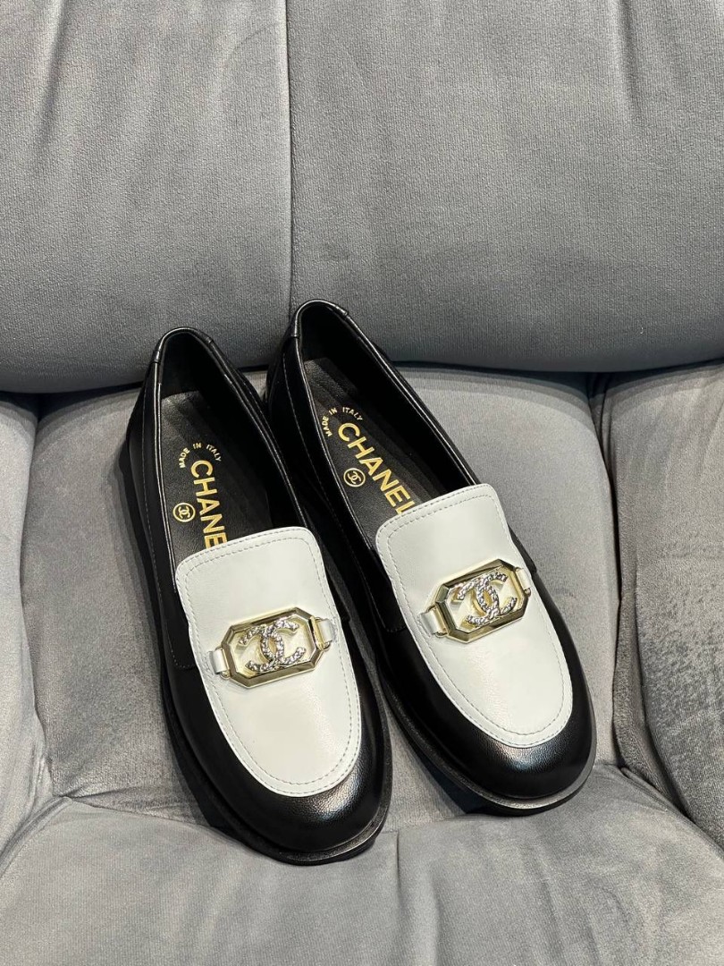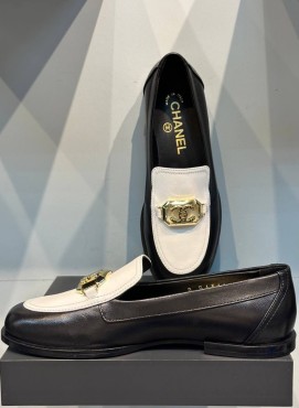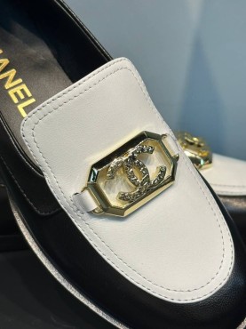 Женские кожаные лоферы Chanel 2024 черные с белым с пряжкой