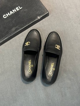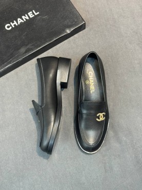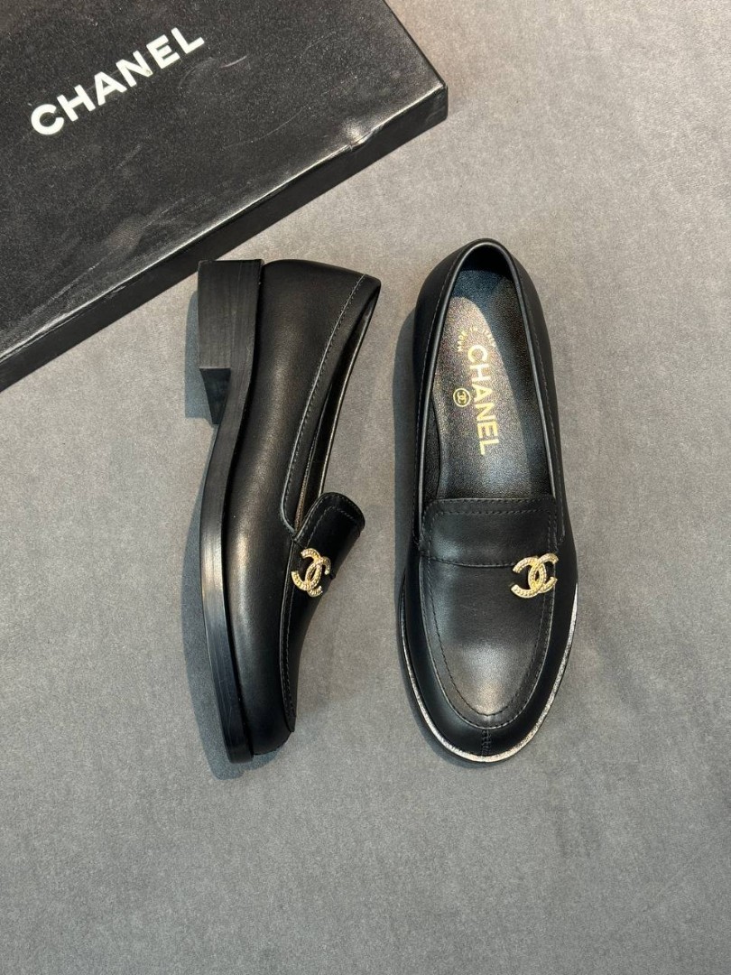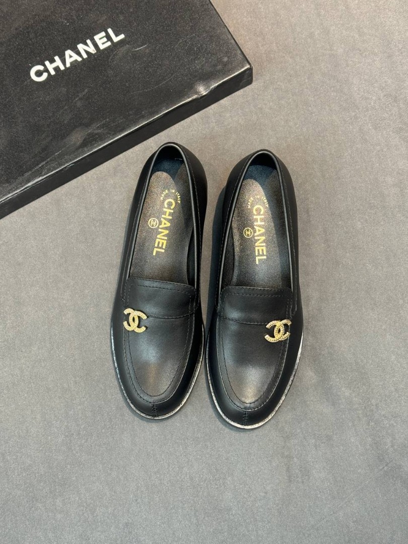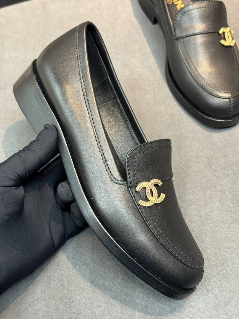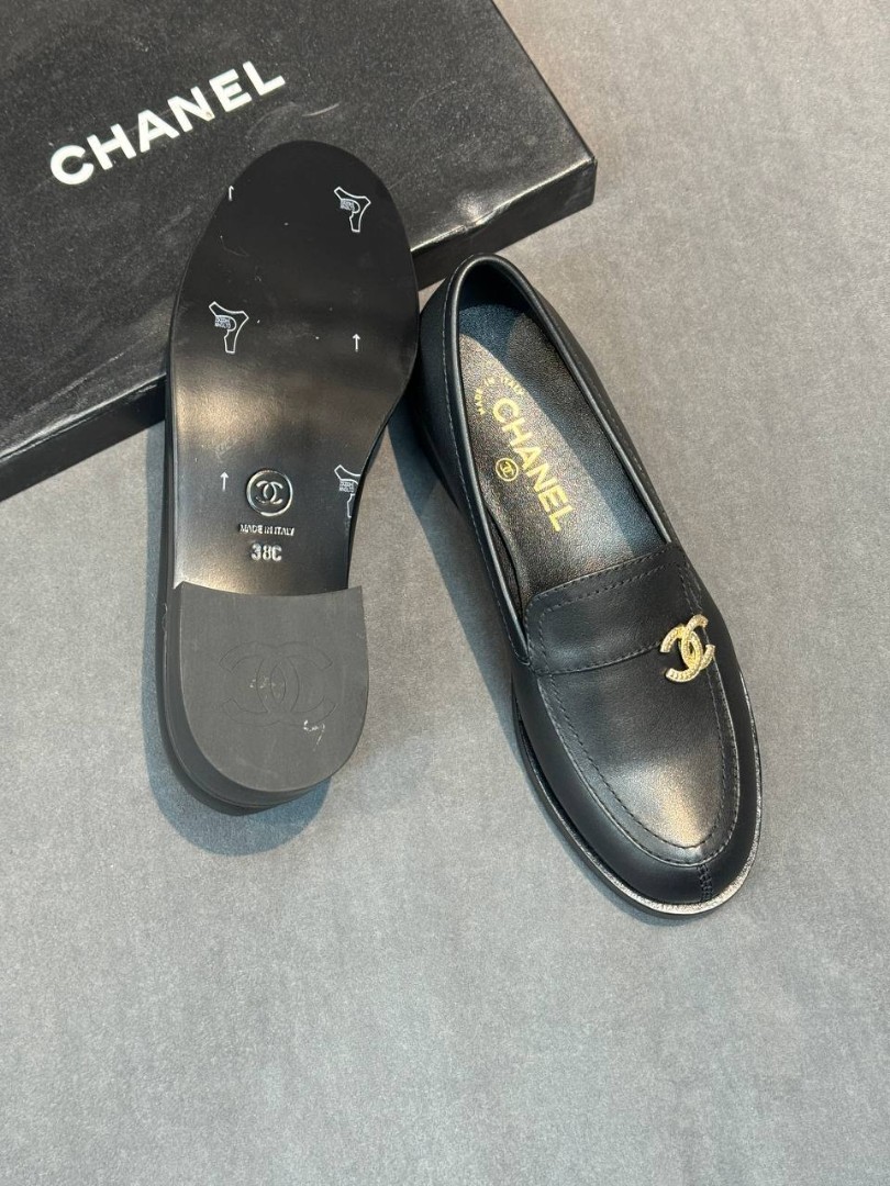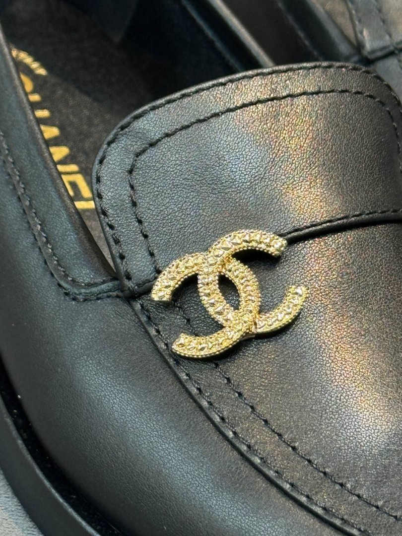 Женские кожаные лоферы Chanel черные с золотой эмблемой 2025
