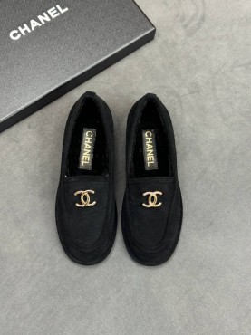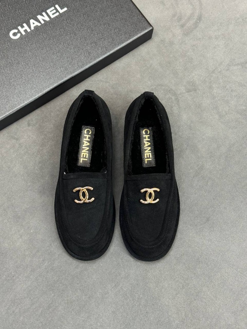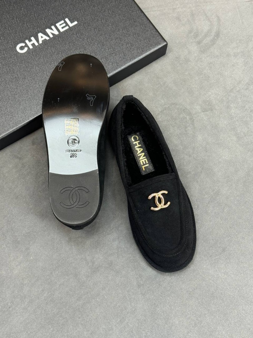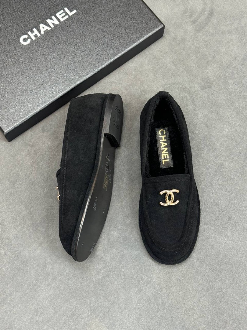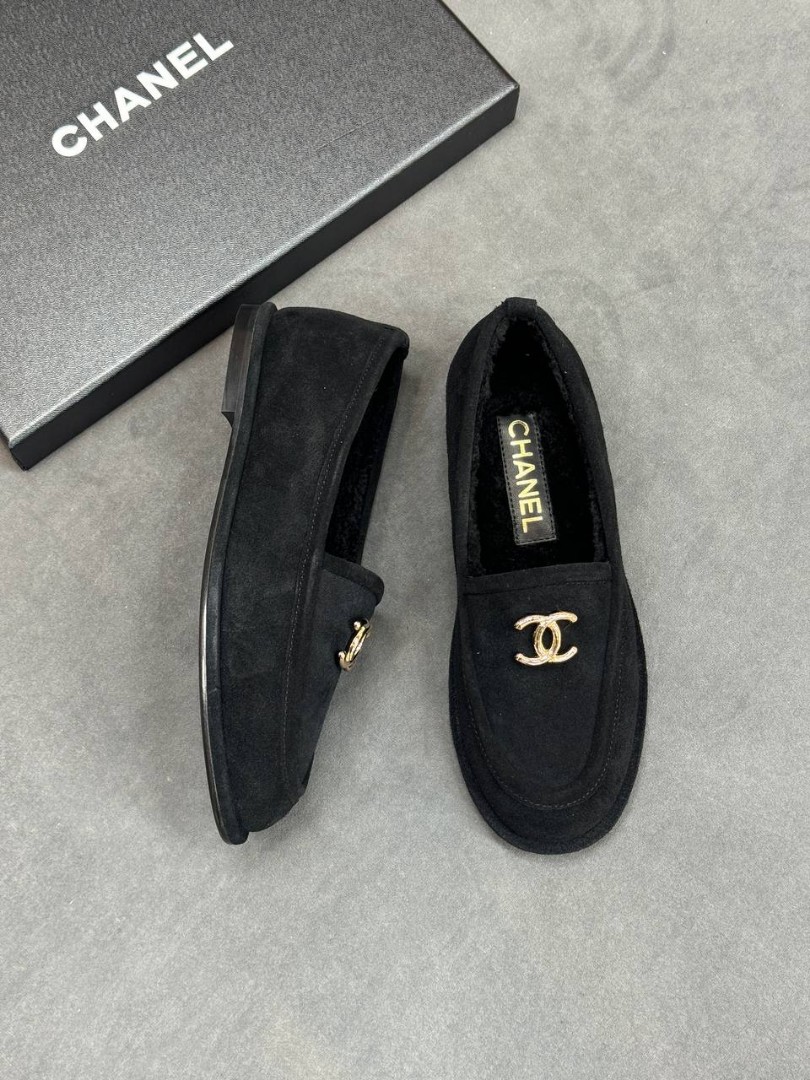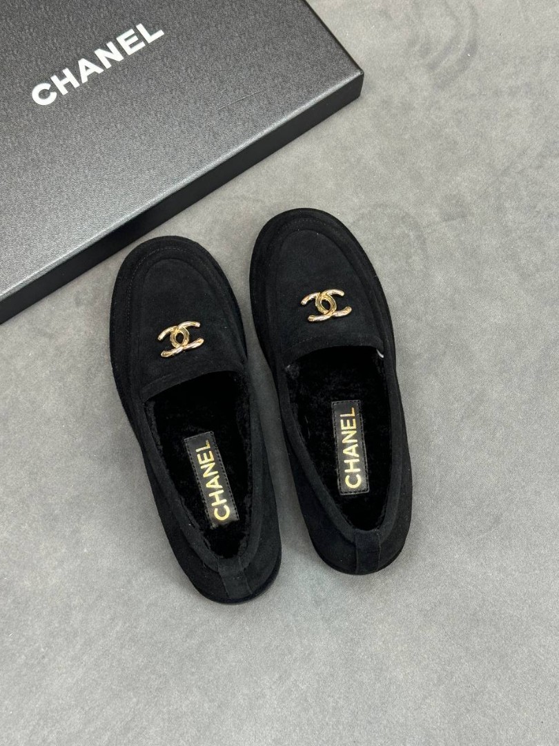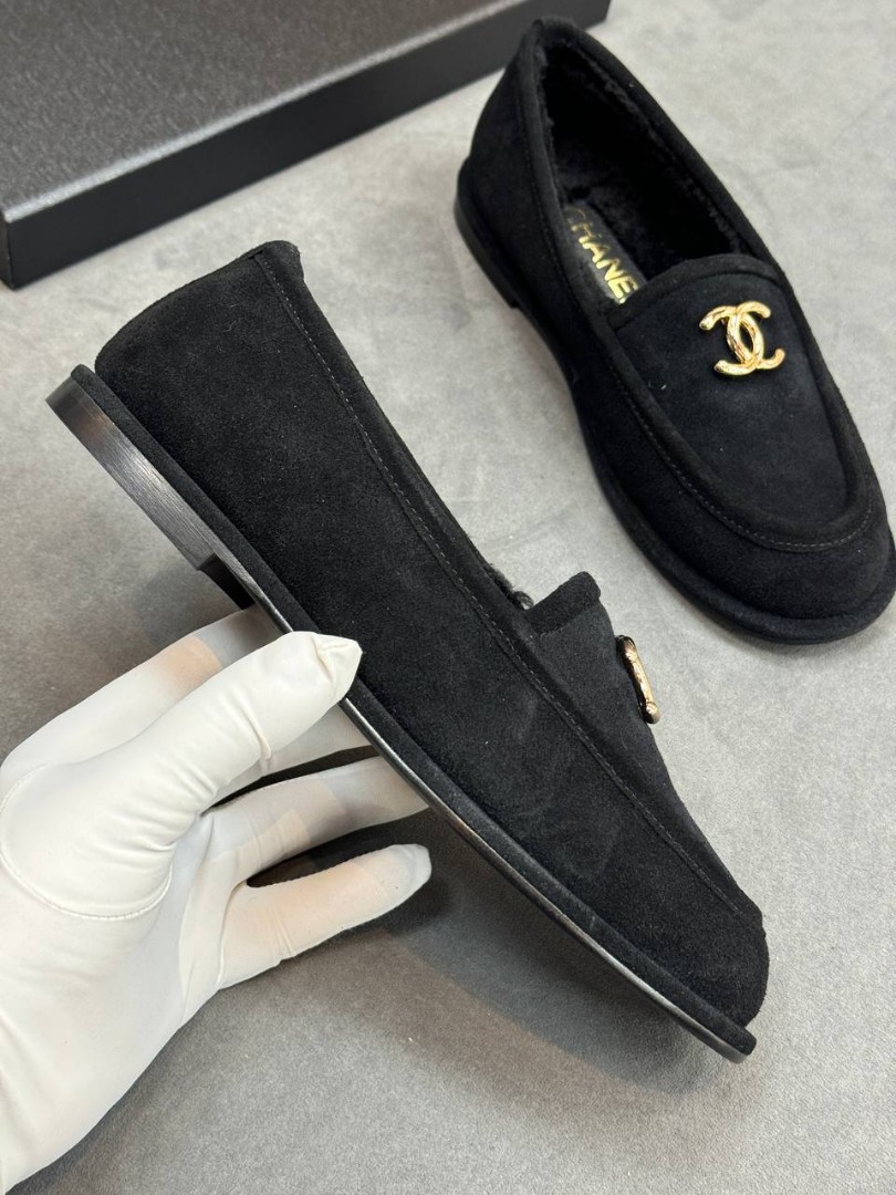 Женские замшевые лоферы Chanel черные с мехом 2025
