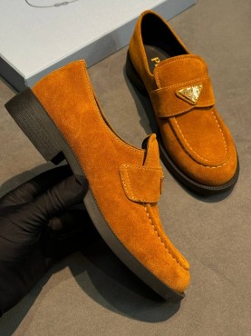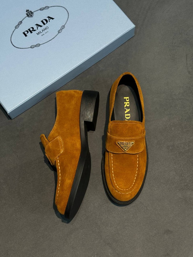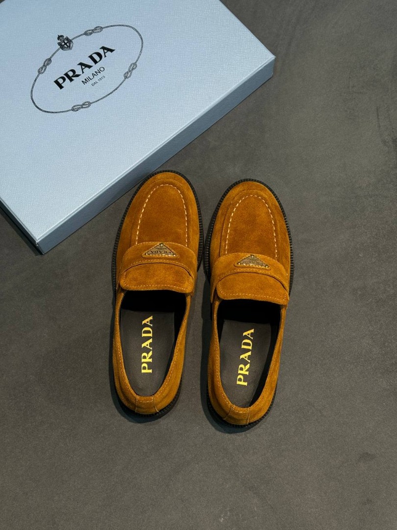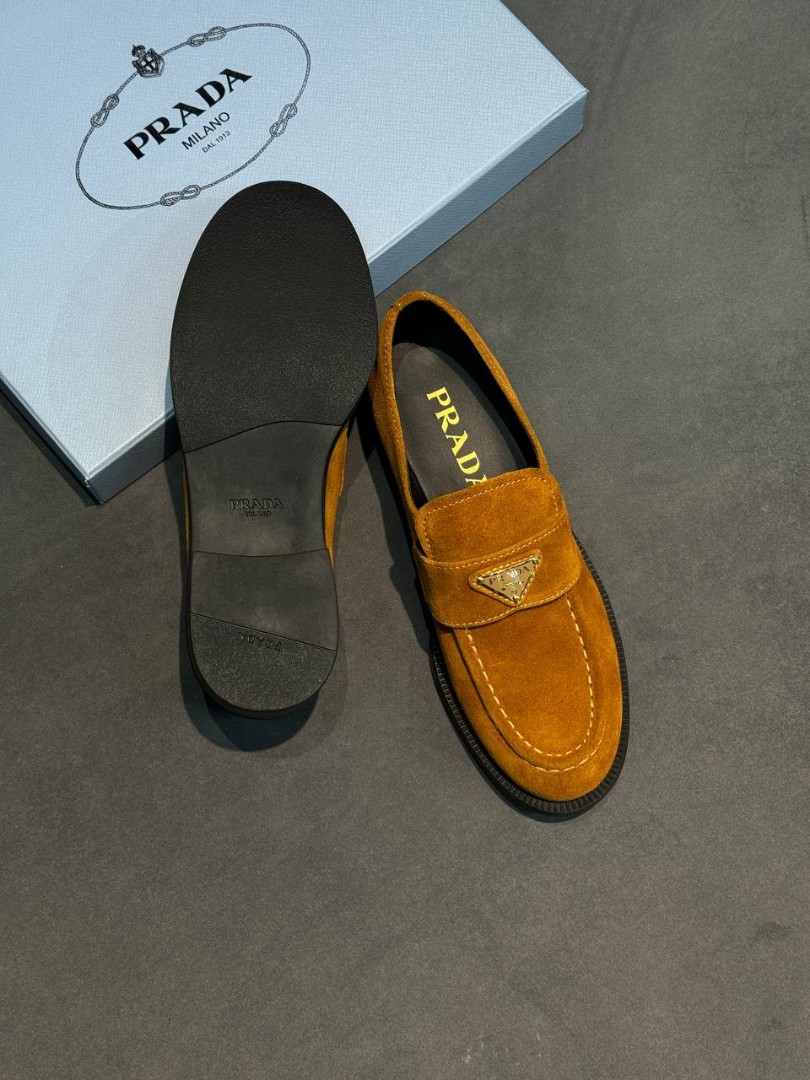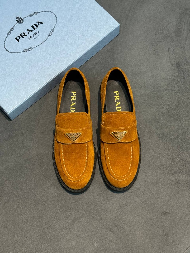 Женские замшевые лоферы Prada рыже-коричневые 2025