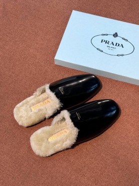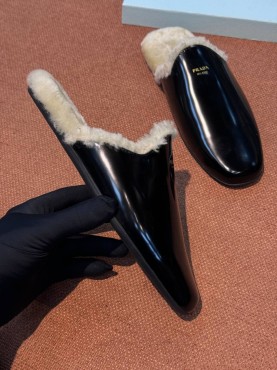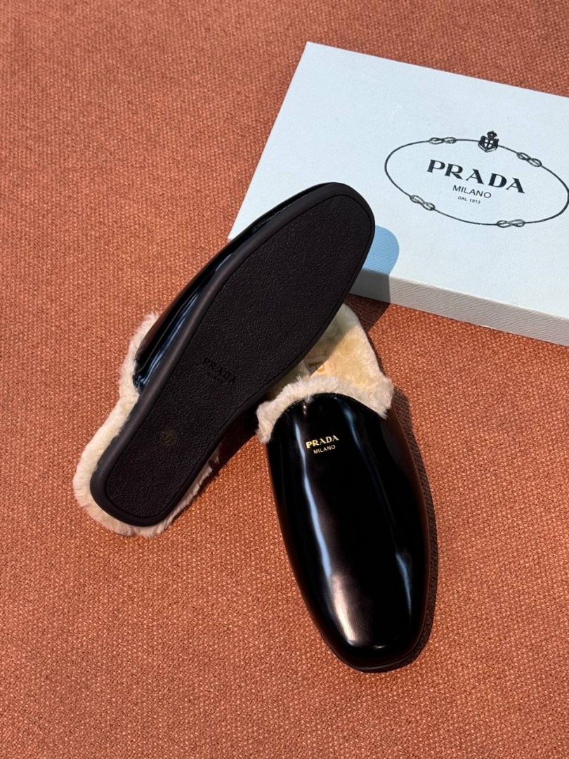 Женские кожаные мюли на меху Prada черные лаковые 2025