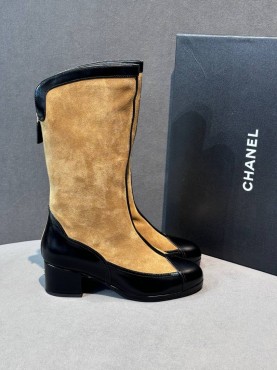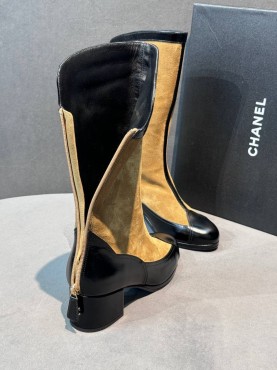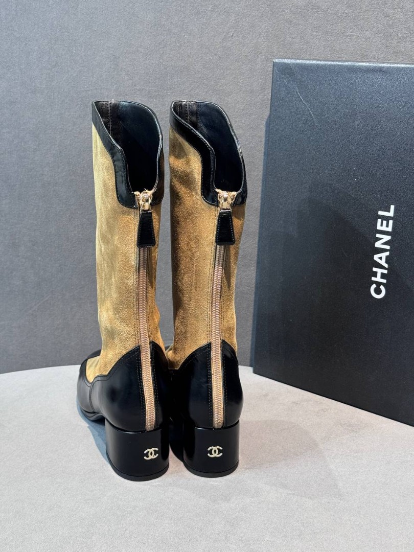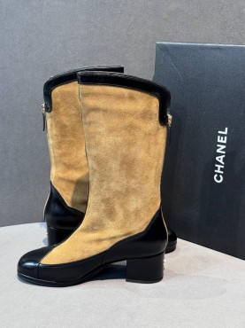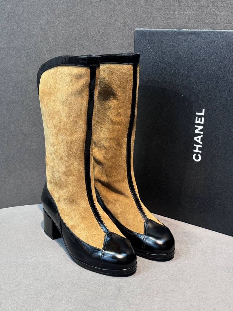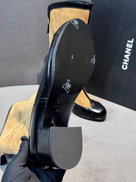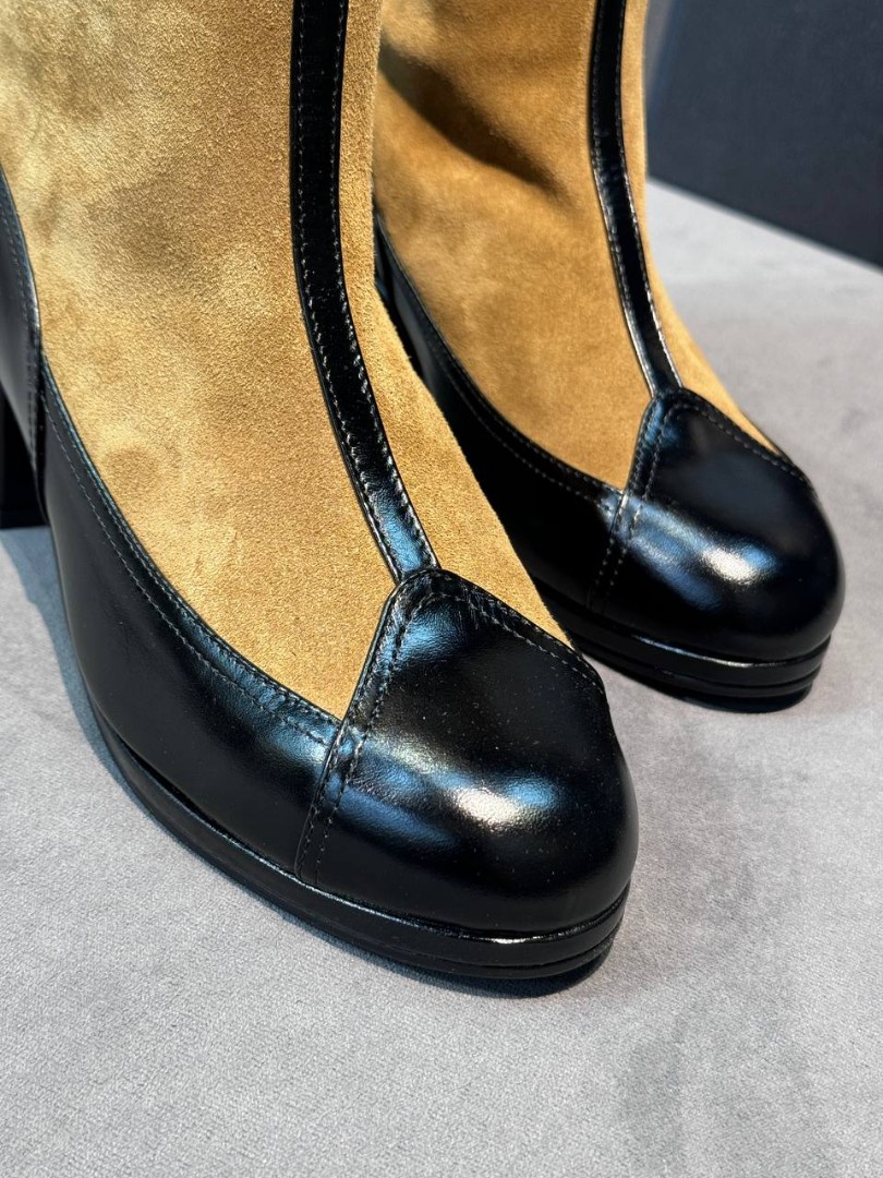 Женские комбинированные сапоги Chanel бежевые с черным каблук 5 см 2025