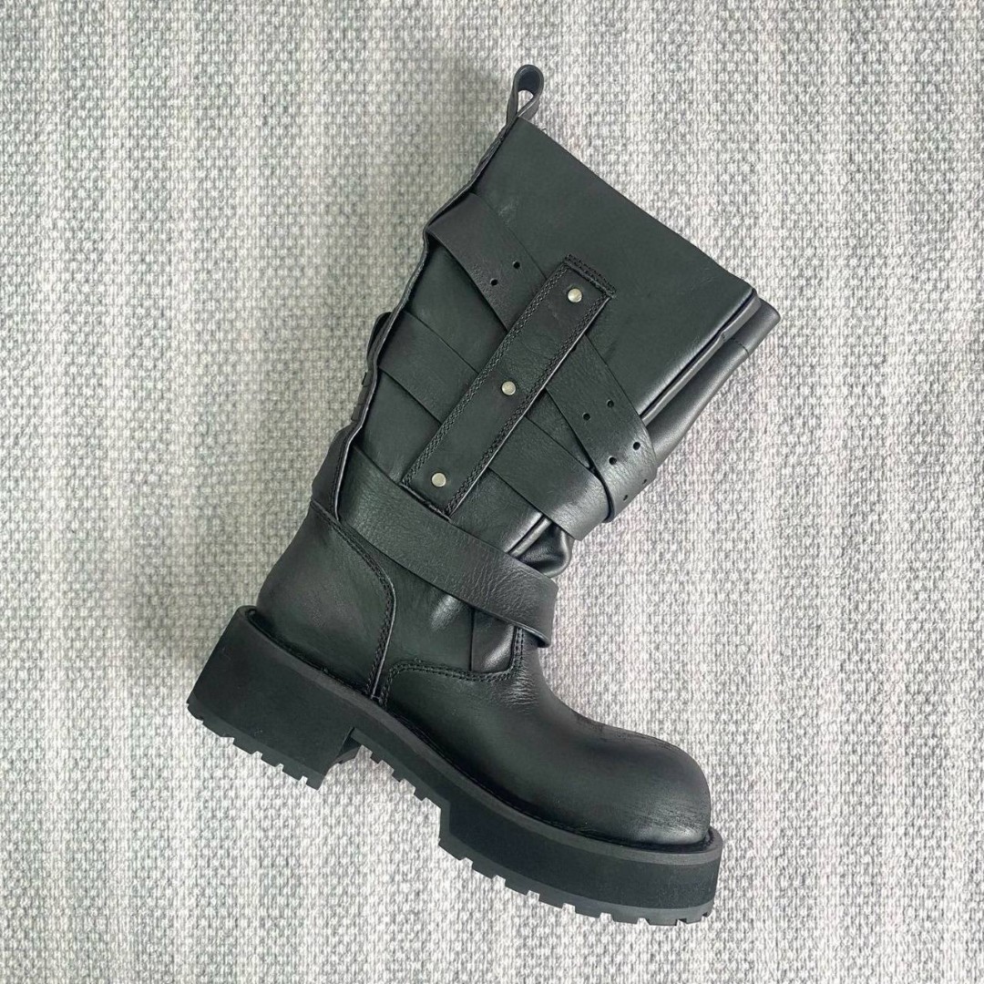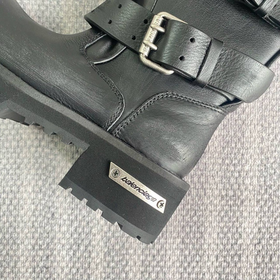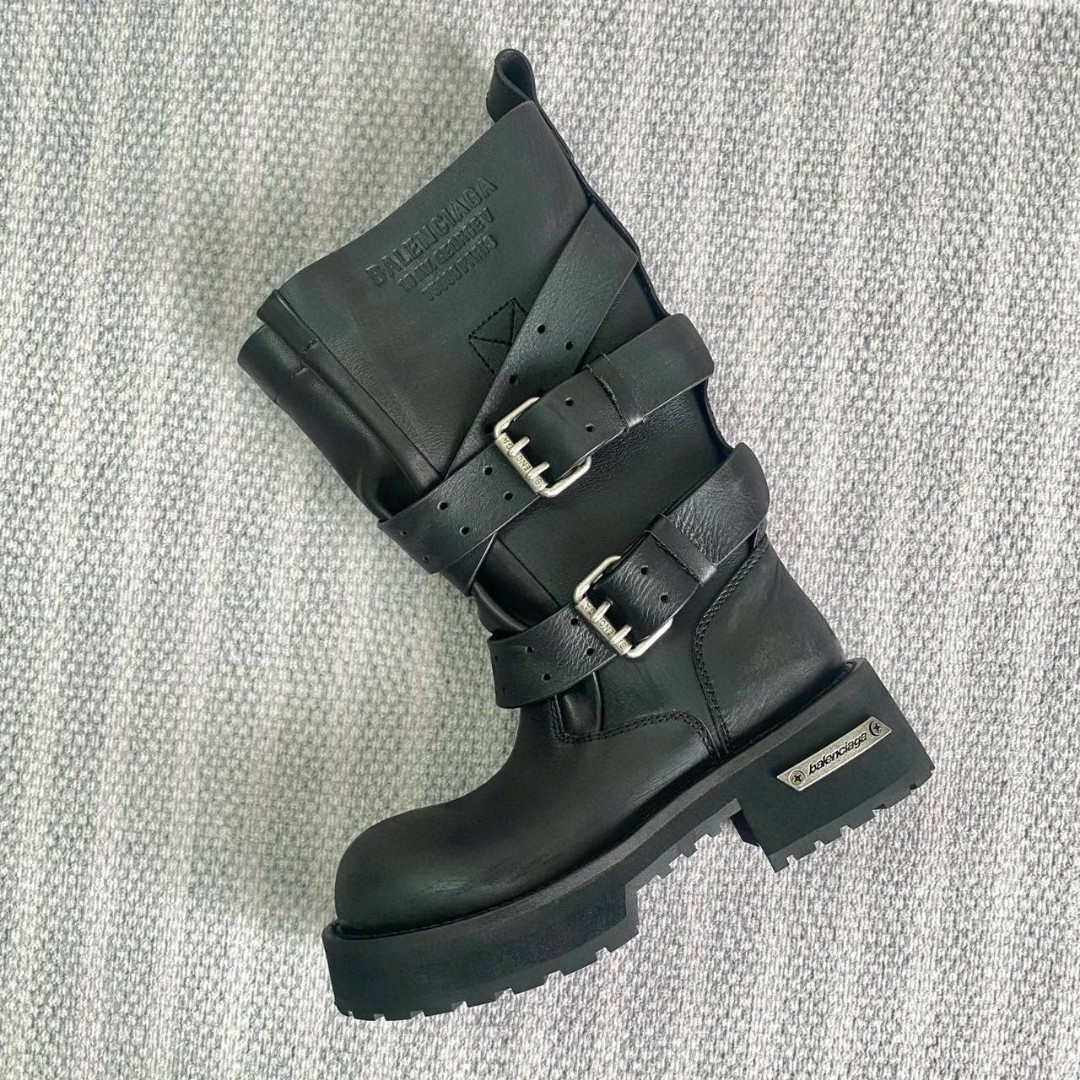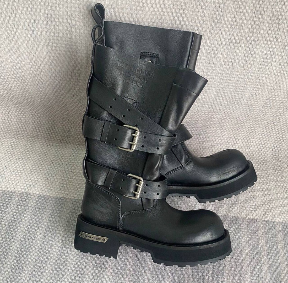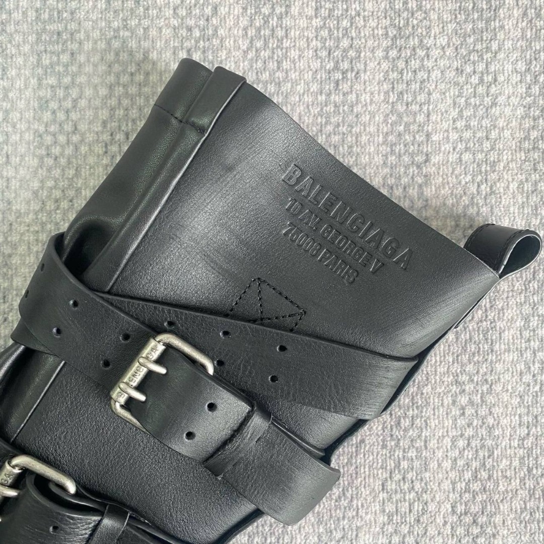 Женские кожаные сапоги Balenciaga черные с ремнем на голенище 2025
