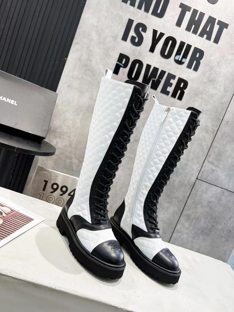 Женские кожаные сапоги Chanel 2023 черные с белым на шнурках