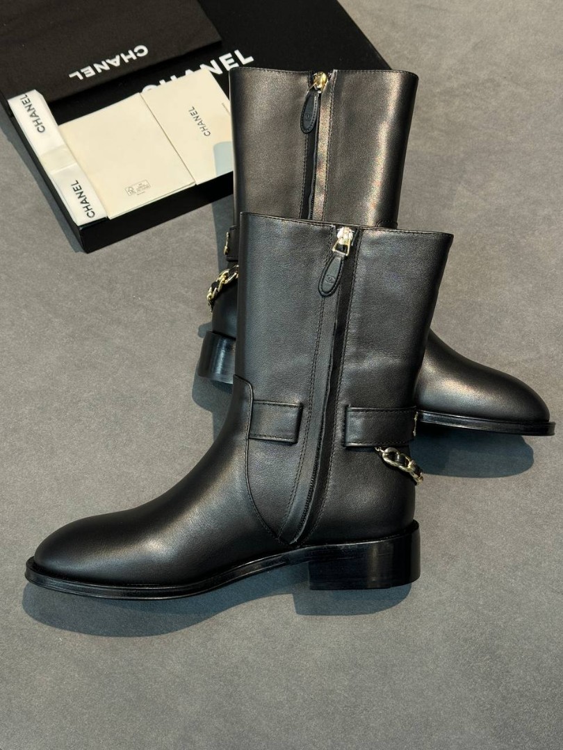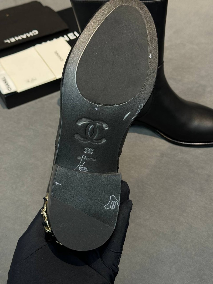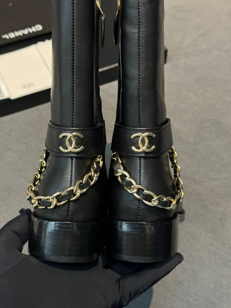 Женские кожаные сапоги Chanel черные с цепочкой 2025