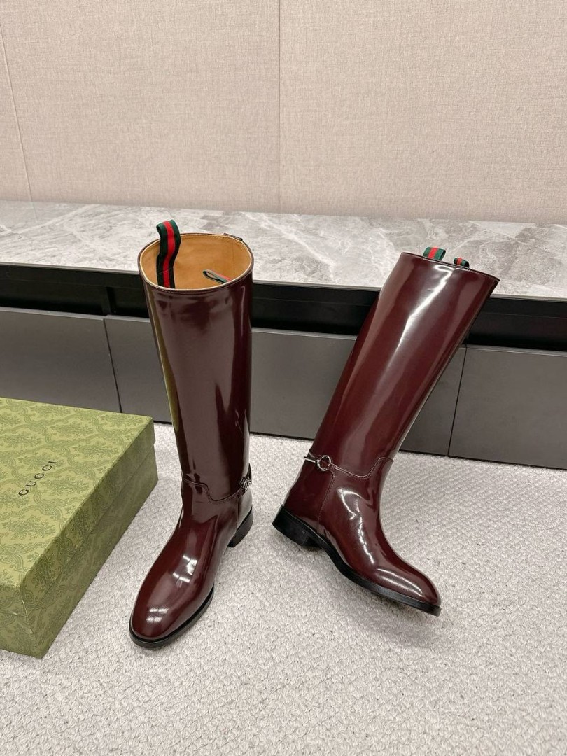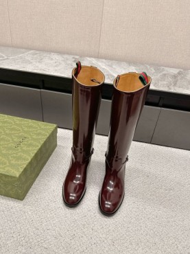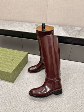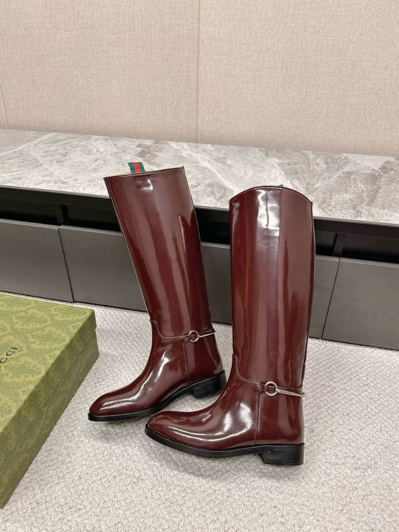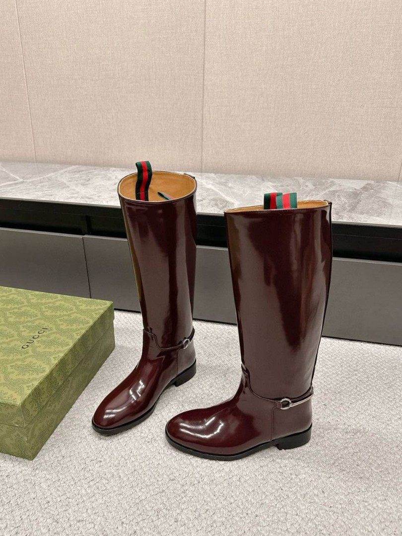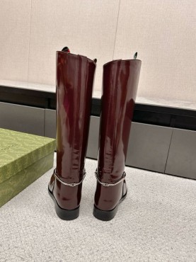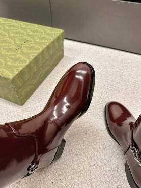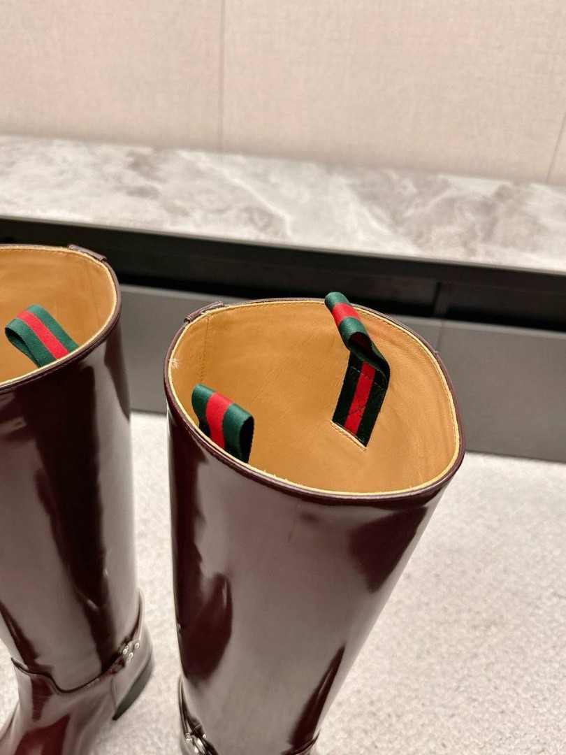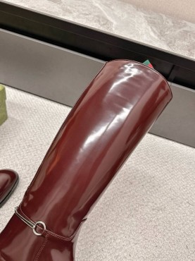 Женские кожаные сапоги Gucci бордовые глянцевые 2025