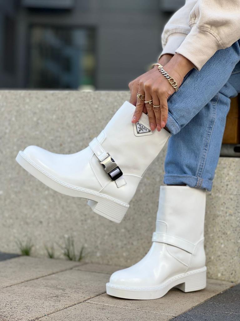 Женские кожаные сапоги Prada 2023 белые с пряжкой