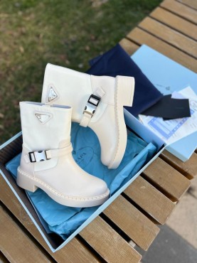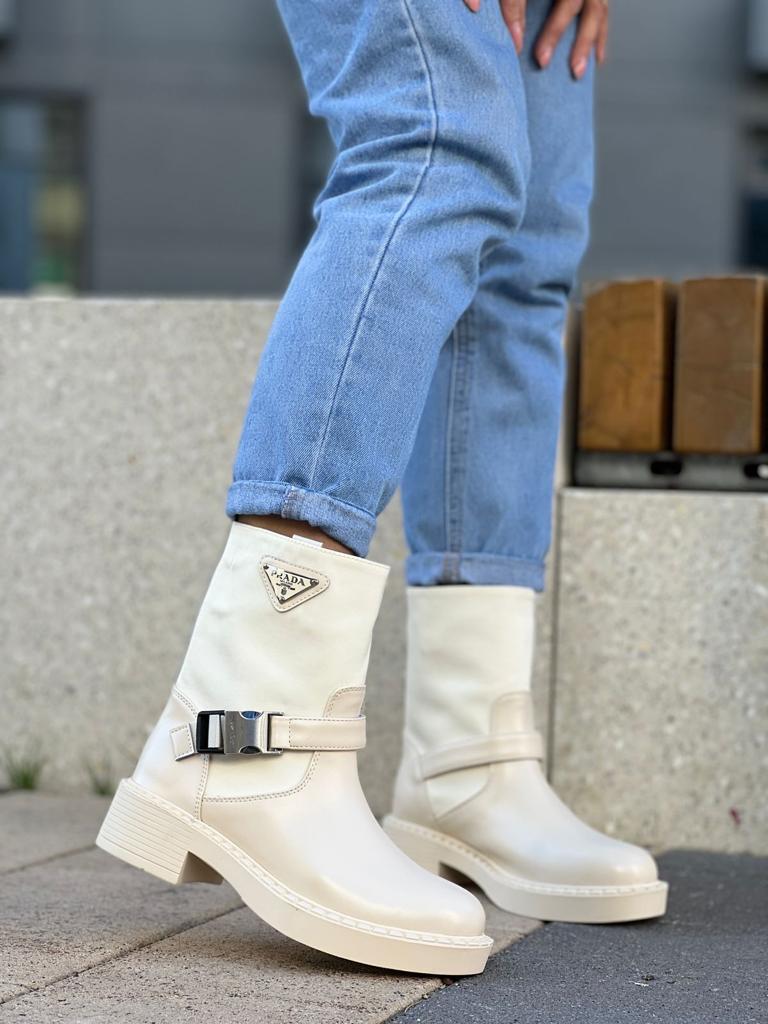 Женские кожаные сапоги Prada 2023 бежевые с пряжкой