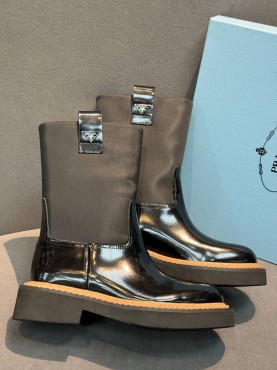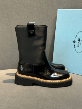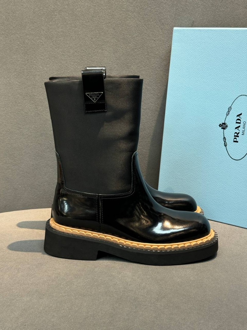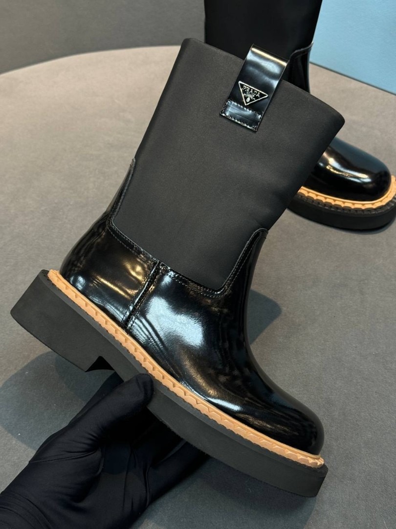 Женские кожаные сапоги Prada черные глянцевые каблук 4 см 2025