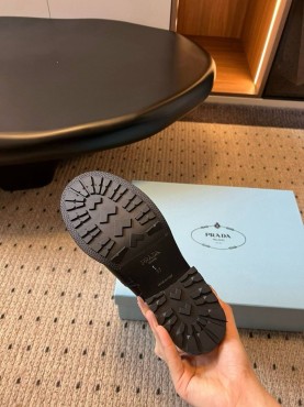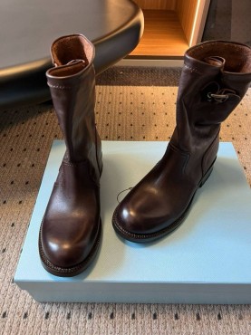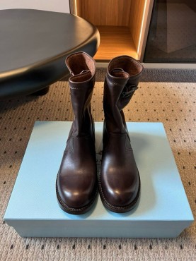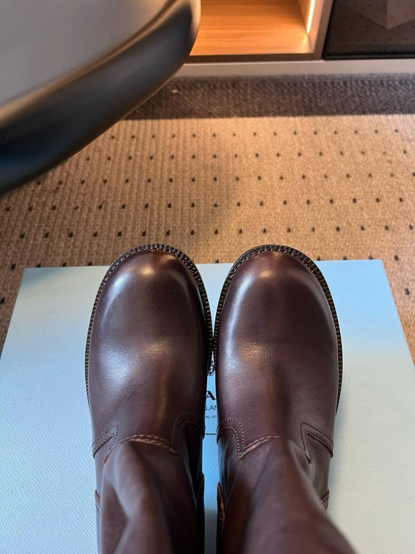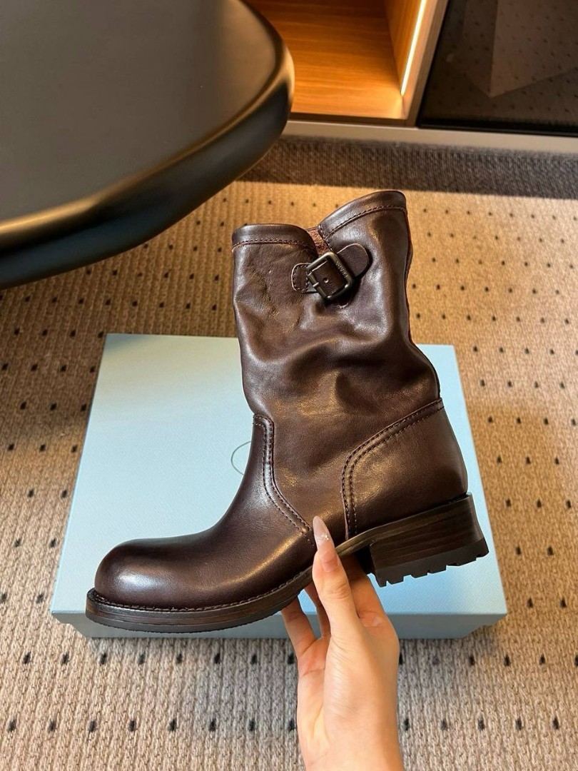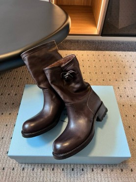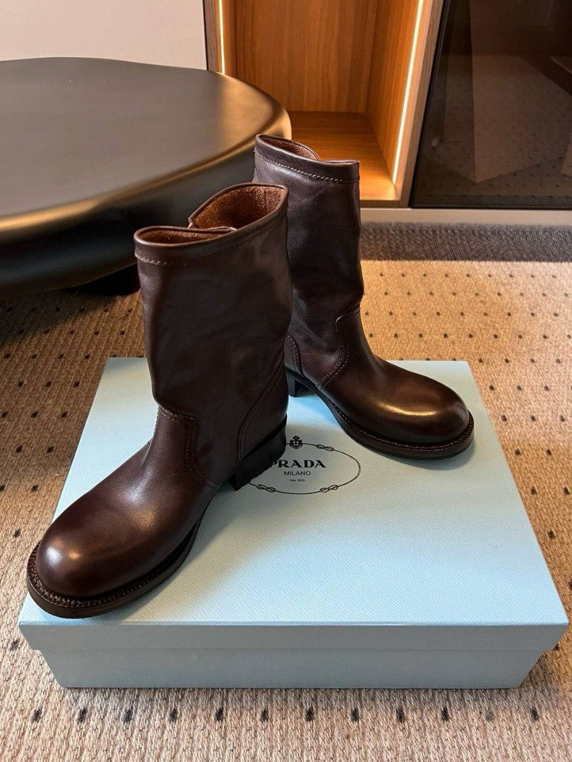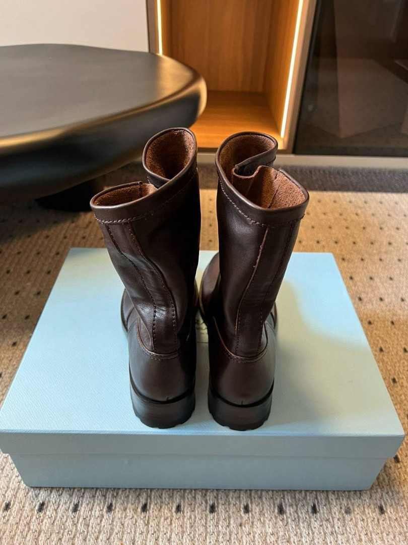 Женские кожаные укороченные сапоги Prada коричневые 2025