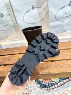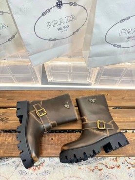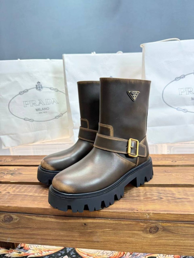 Женские кожаные укороченные сапоги Prada коричневые с потертостями 2025