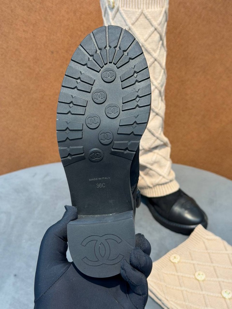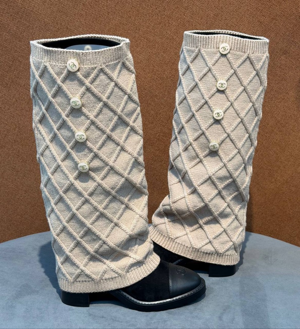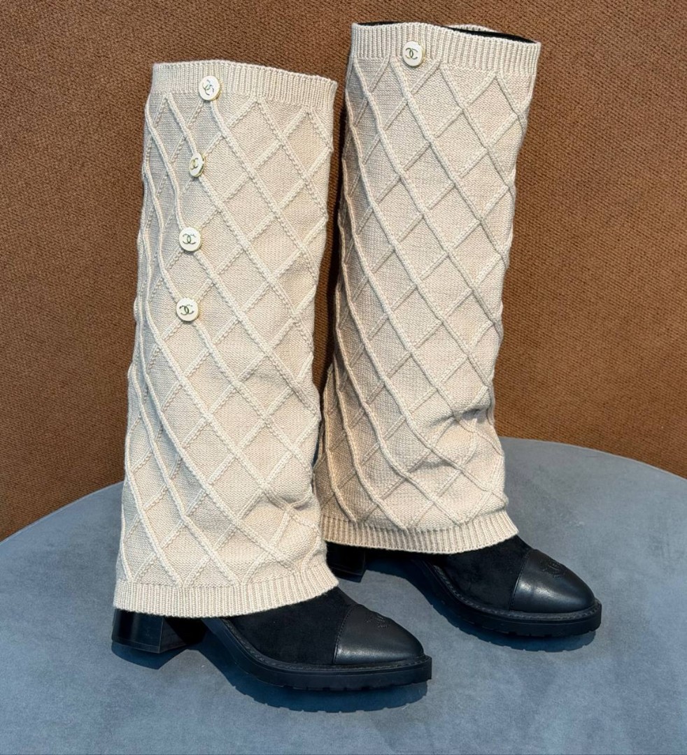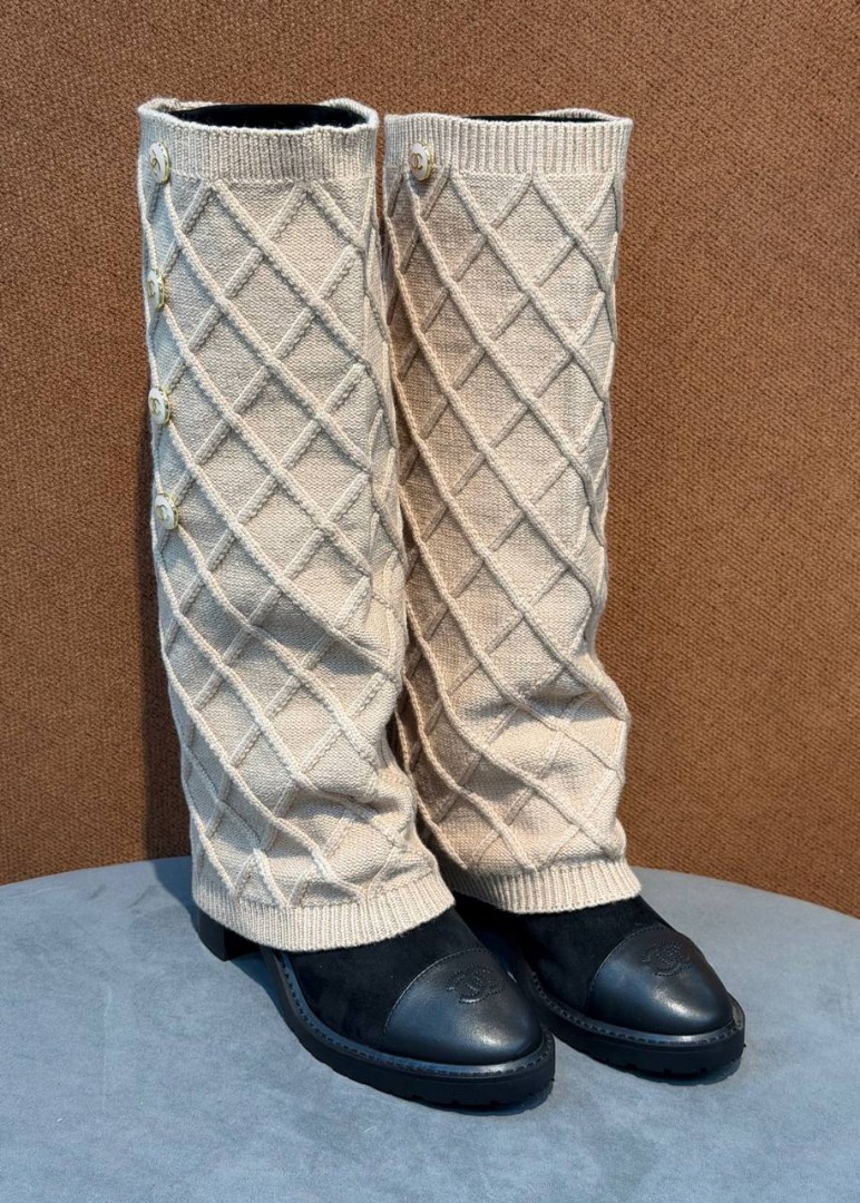 Женские замшевые сапоги Chanel черные с вязаными съемными молочными гетрами каблук 7 см 2025