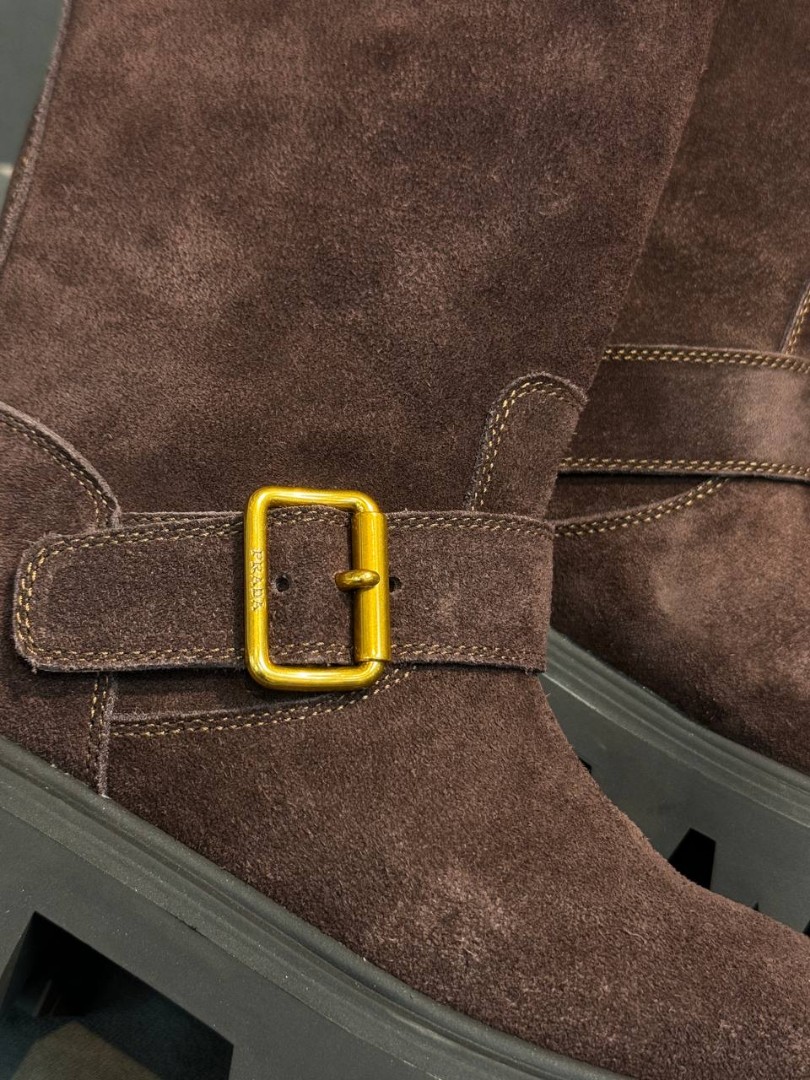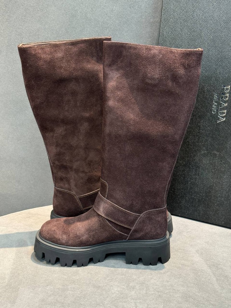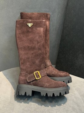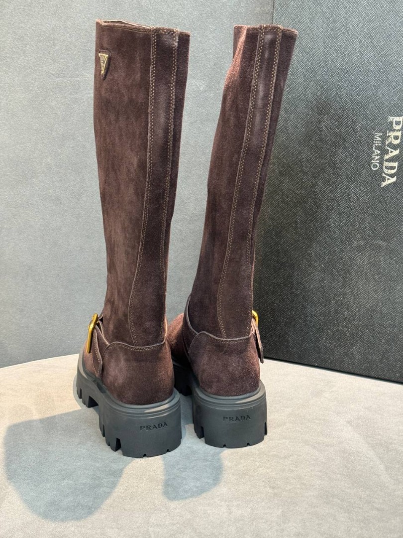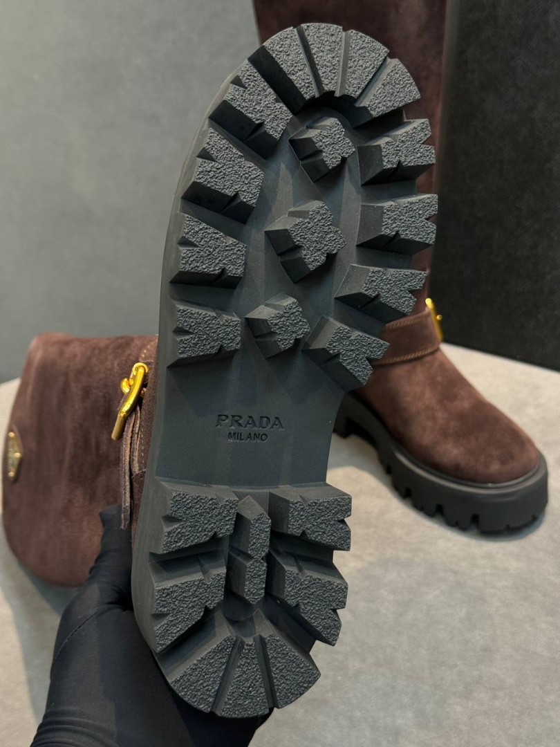 Женские замшевые сапоги Prada коричневые с пряжкой 2026