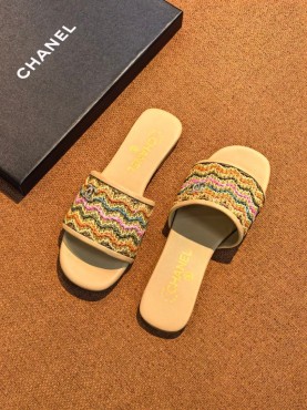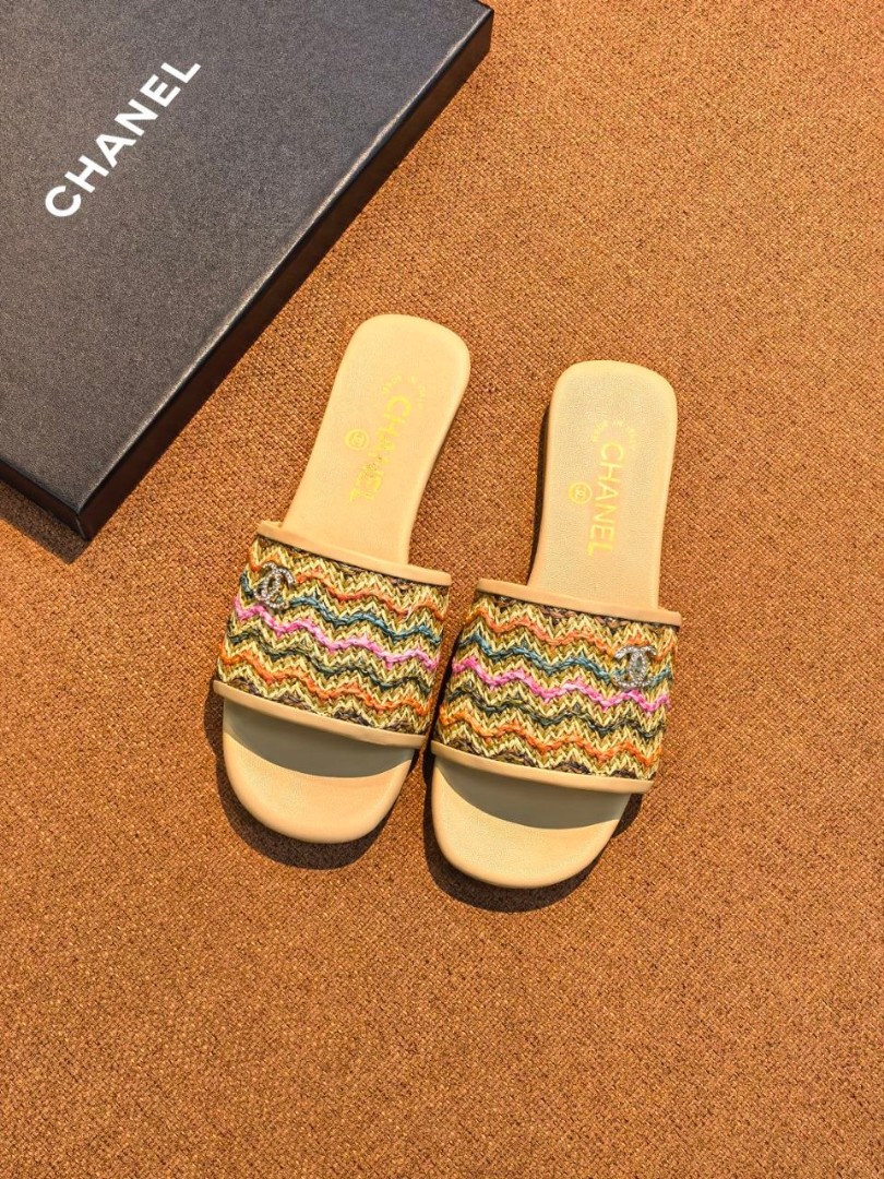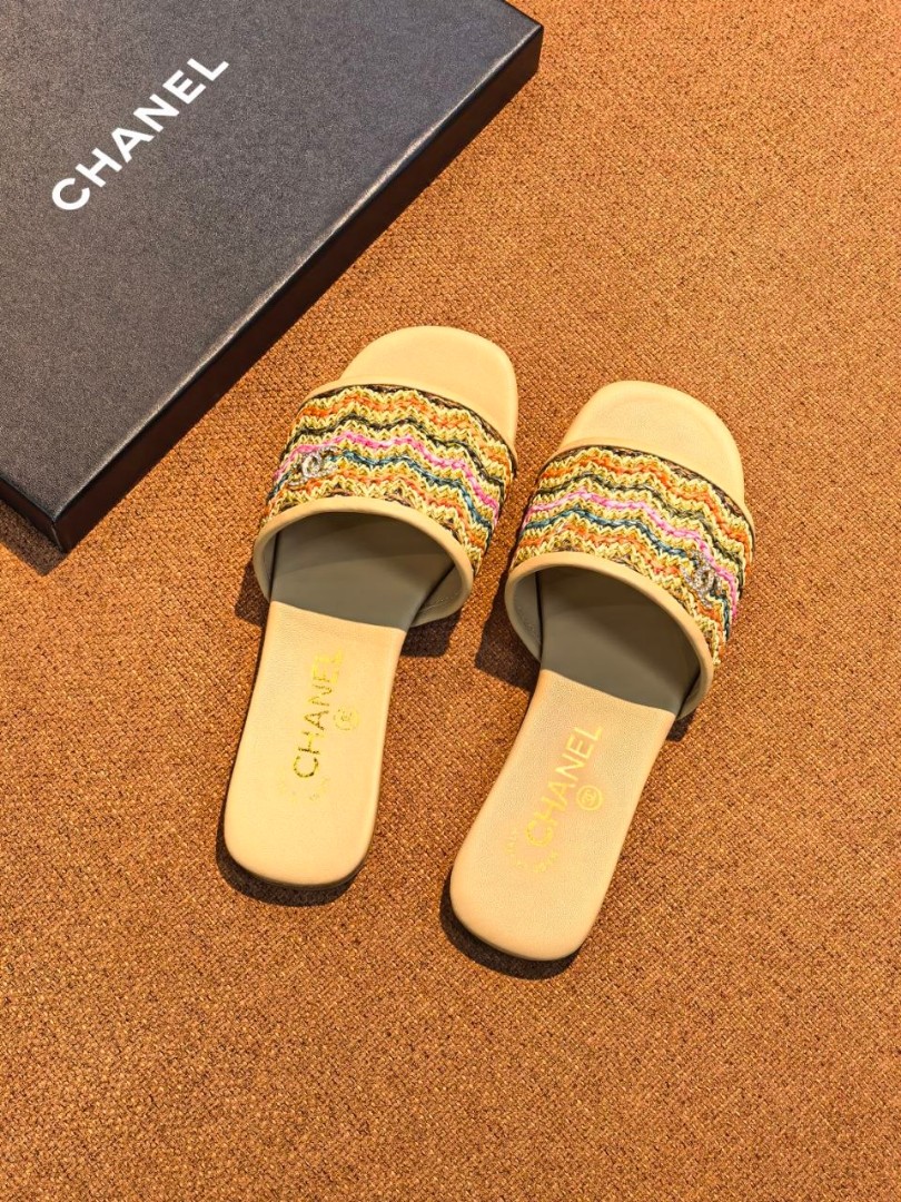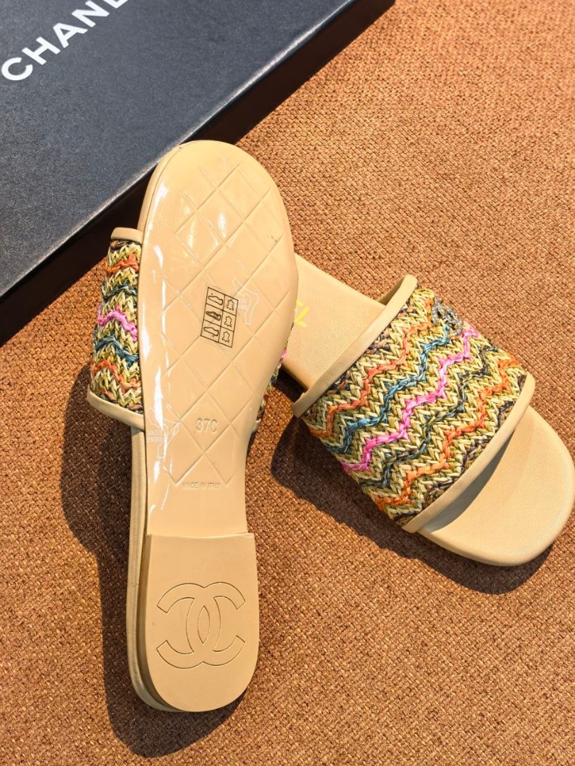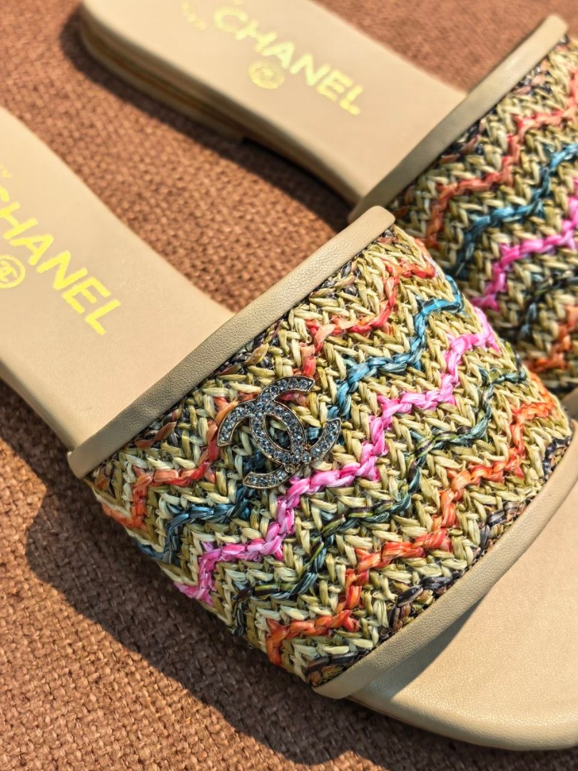 Женские кожаные шлепанцы Chanel бежевые с разноцветным плетением 2026