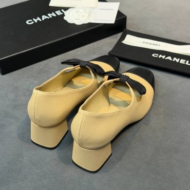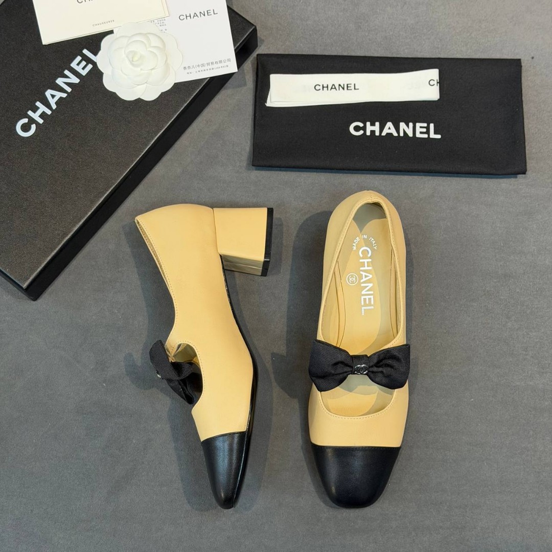 Женские кожаные туфли Chanel бежевые с черным носом каблук 5 см 2026