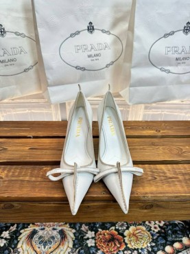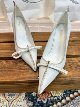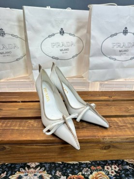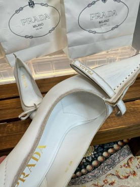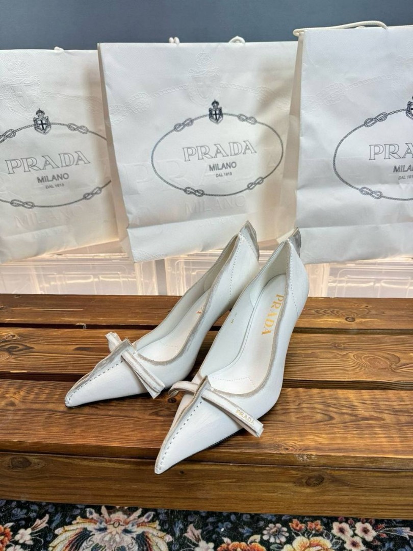 Женские кожаные туфли Prada белые с потертостями каблук 8 см 2025