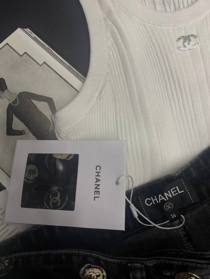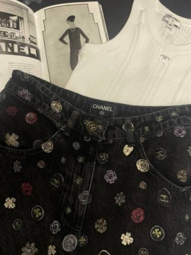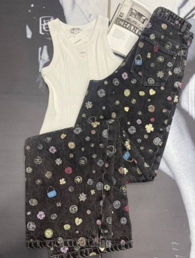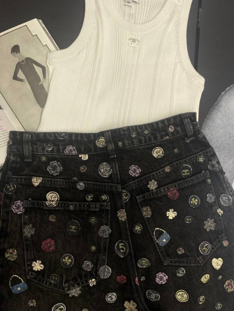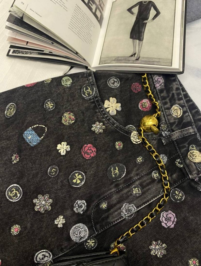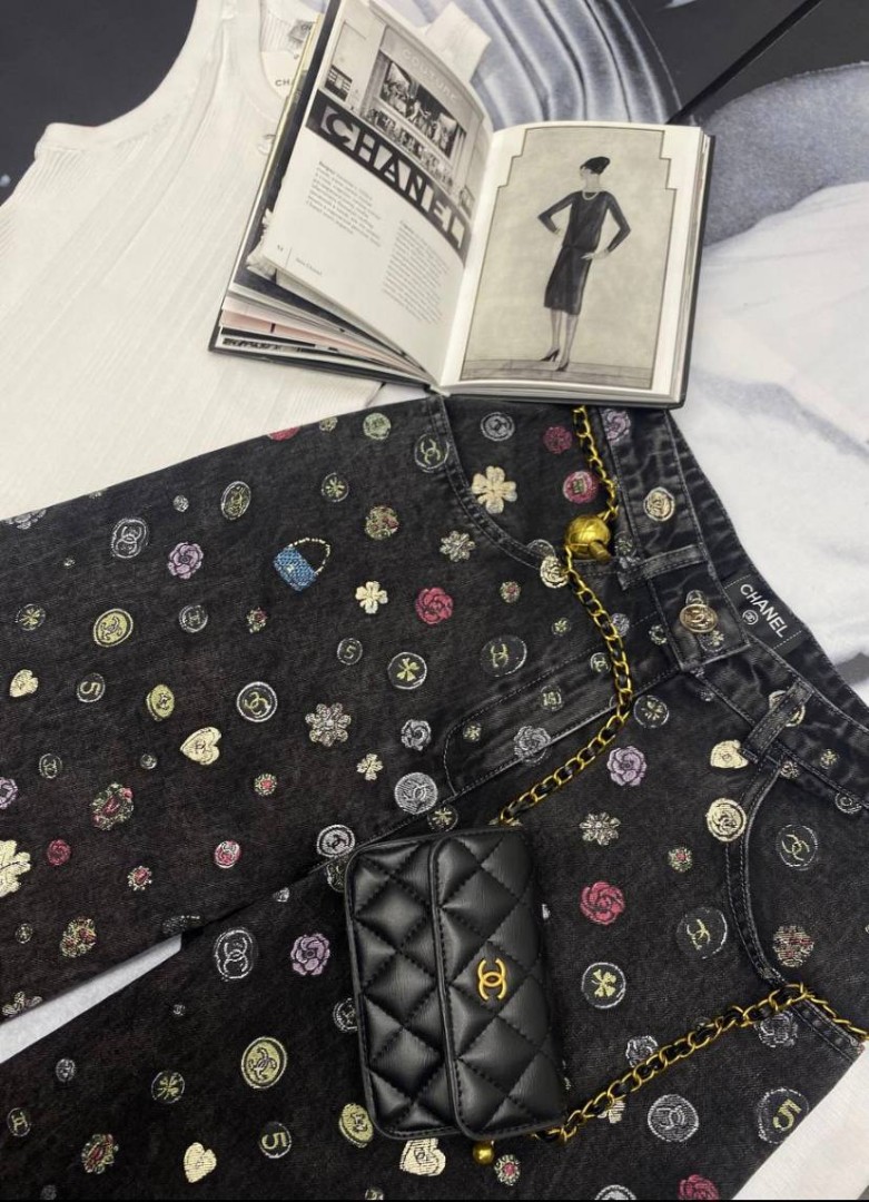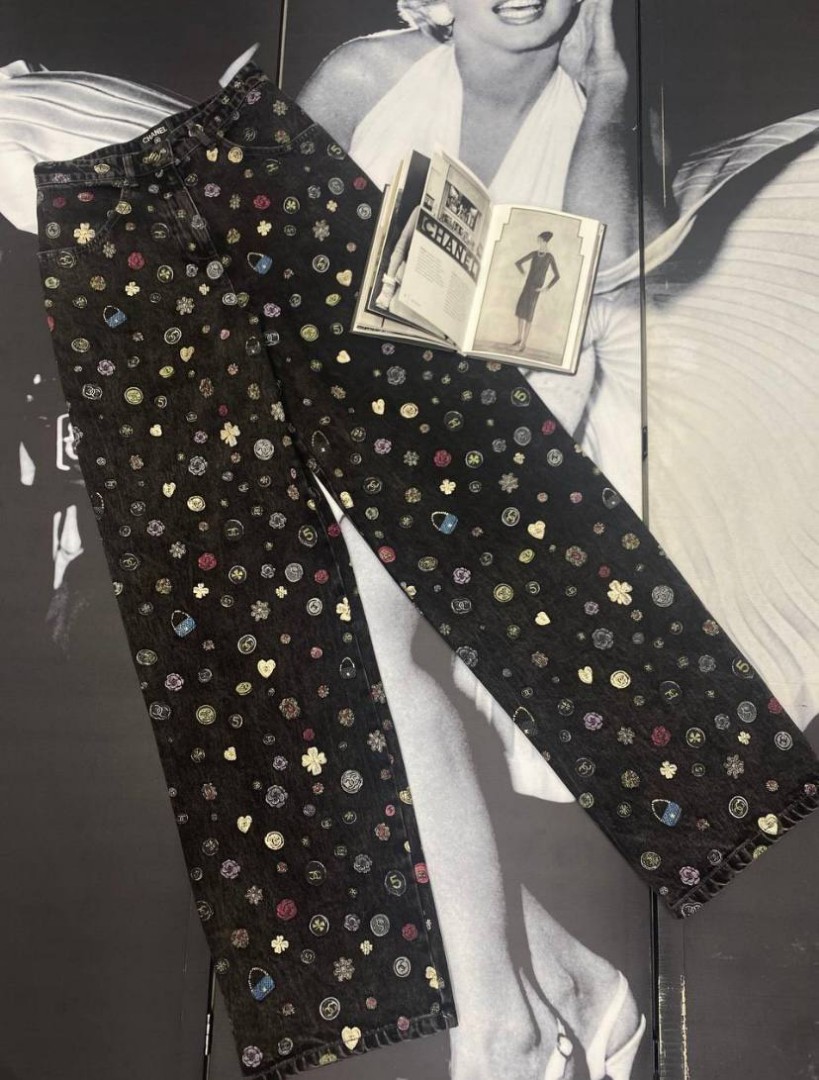 Женские джинсы Chanel черные с мелким разноцветным принтом 2025