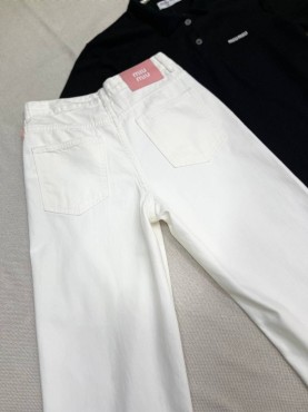 Женские джинсы Miu Miu белые с красной вышивкой бисером 2024