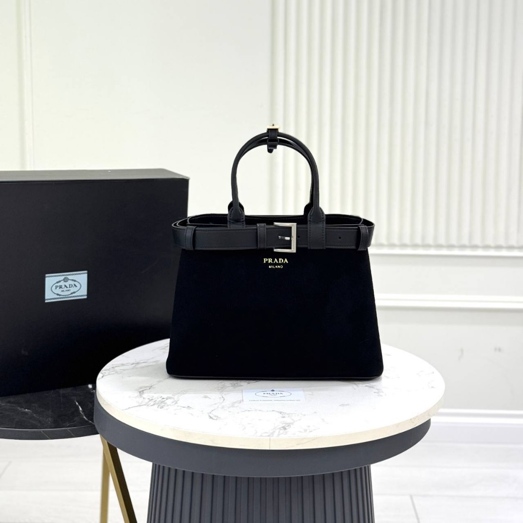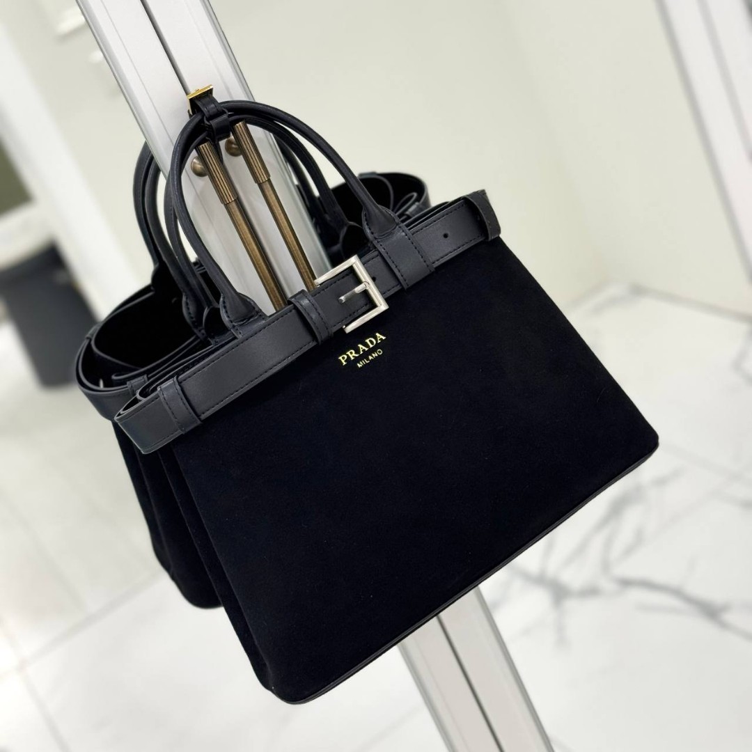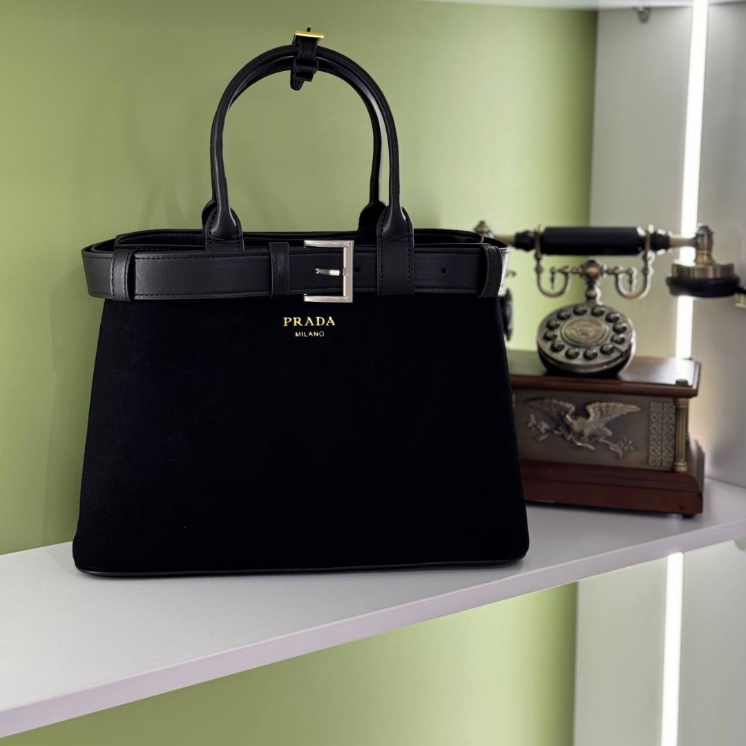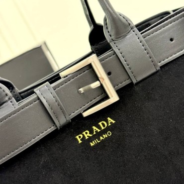Женская замшевая сумка Prada черная с кожаными элементами 33х23 2025